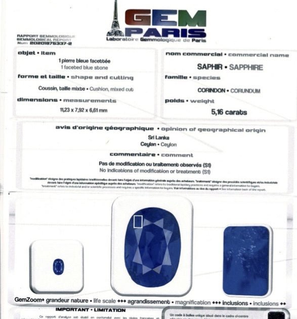 A 750/000 white gold ring centered on a 5.16-carat oval sapphire supported by 4 baguette-cut diamonds. Gem Paris certificate: Sri Lanka, unheated. Width: 11mm Height: 7mm Weight: 5.3 grams Diamond weight: 0.94 carat Finger size: 53