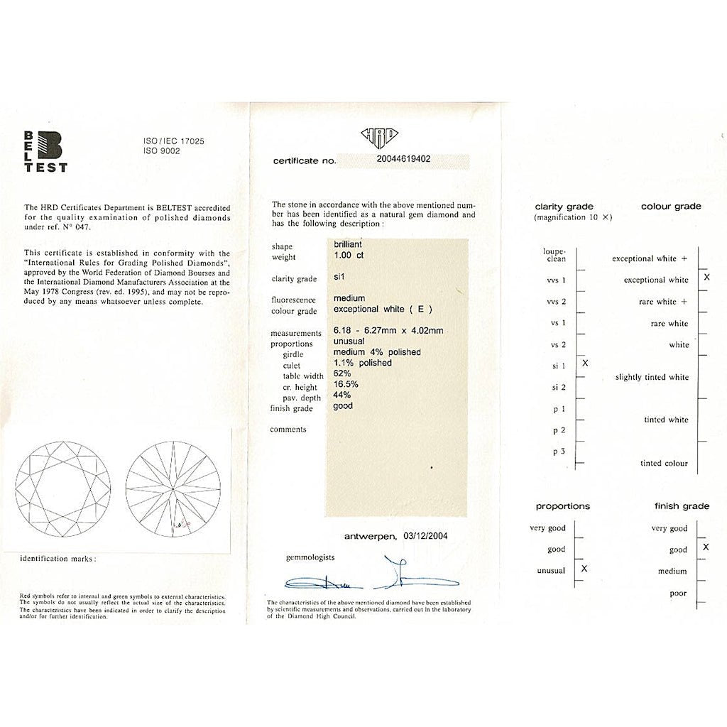 A solitaire ring in 750/00 pink gold set with a brilliant-cut diamond weighing 1 carat. Diamond quality: E/SI1. HRD certificate. Weight: 3 grams Diamond weight: 1 carat Finger size: 51