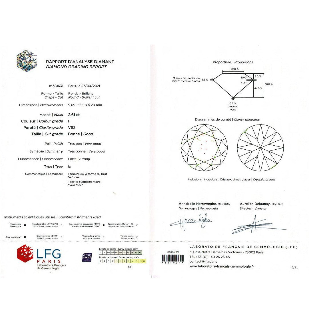 A Mauboussin solitaire ring in 750/000 yellow gold set with a 2.61 carat diamond F - VS2. Certificate from the French Gemmology Laboratory (LFG) Width: 9mm Height: 7mm Weight: 13 grams Diamond weight: 2.61 carats Finger size: 52