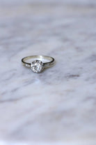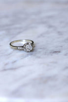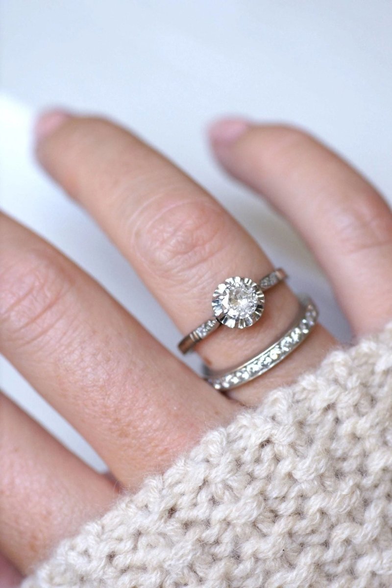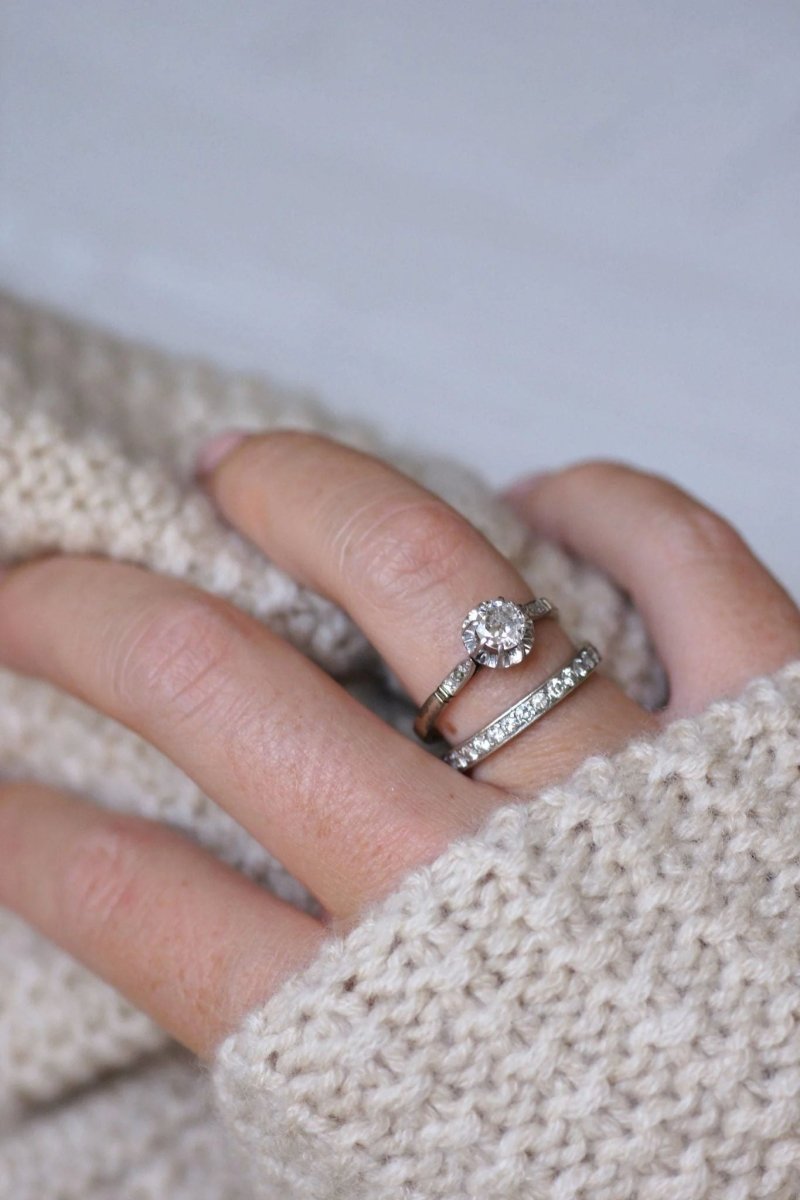 Solitaire ring in 18kt white gold and platinum (hallmarks: owl and Mascaron) set in its center with an old-fashioned cut diamond, weighing approximately 0.50 Ct (estimated color H, estimated purity SI) and a shoulder of cut diamonds in pink. Work circa 1935, Art Deco . Gross weight: 3.00 g Finger size: 59 (diameter 18.75 / US 8.75) Height: 0.80cm Condition: very light micro scratches and oxidation on the gold and platinum parts, natural inclusions in the diamond, see photos. Did you know that the diamond comes from the Greek adamao which means “I master”? It originally designates the hardest materials. The solitaire is the engagement ring , a token of love par excellence, it has existed since the 15th century. Each time it is a ring set with a main diamond, sometimes with a shoulder of diamonds on the sides. All our engagement rings.