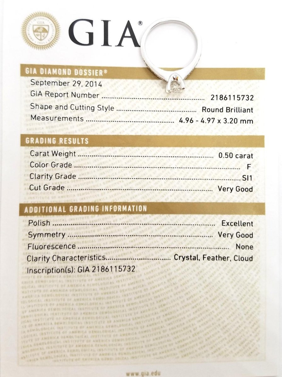 Solitaire in 750 thousandths (18 carat) white gold set with diamonds for 0.66 cat in total. including brilliant-cut central diamond F-SI1 of 0.50 ct GIA certified. and supported by 16 brilliant-cut diamonds for a total of 0.16 ct. finger size: 52. width on top: 0.50 cm. ring width: 0.17 cm. eagle head hallmark. total weight: 3.19 g. new condition