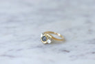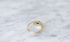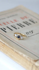 Belle Epoque Toi et Moi engagement ring in yellow gold and platinum (hallmark: eagle's head), decorated in its center with a round sapphire, weighing approximately 0.30 Ct, in a shoulder of old-fashioned cut diamonds weighing approximately 0.35 Ct in total (estimated color H, and estimated clarity VS1). Work Circa 1900, France. Height of central motif: 1.00cm Gross weight: 2.91g Ring size: 57 1/2 (diameter 18.25/ US 8.00). Condition: slight micro scratches on the gold and platinum parts, slight shocks and losses on the stones, see photos. This engagement ring model dates from the end of the 19th century. A so-called Belle Epoque style where gold and platinum are wonderfully combined. The Toi et Moi ring symbolizes the union of two beings, it is often adorned with two different stones representing the personality of each united in love. All our engagement rings.