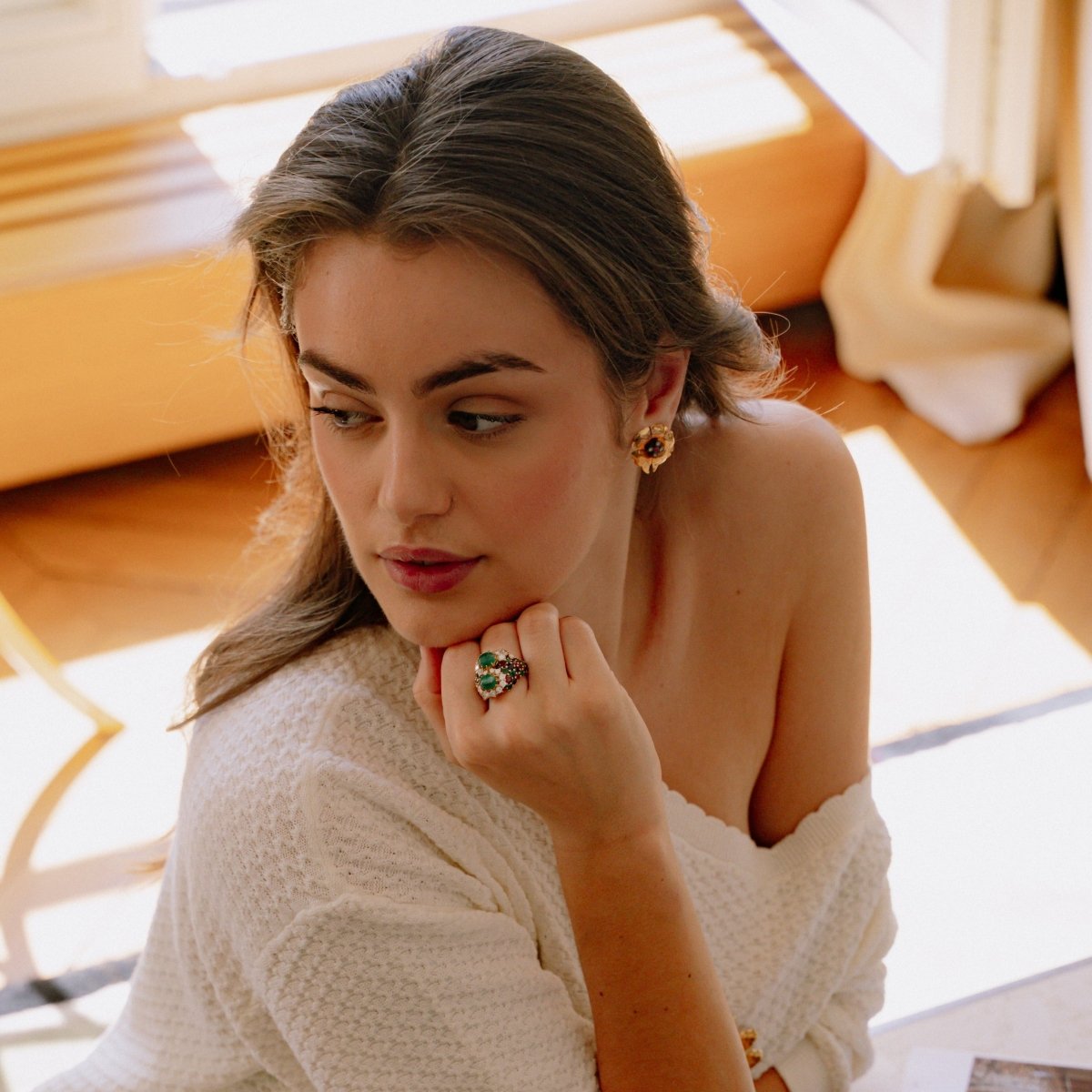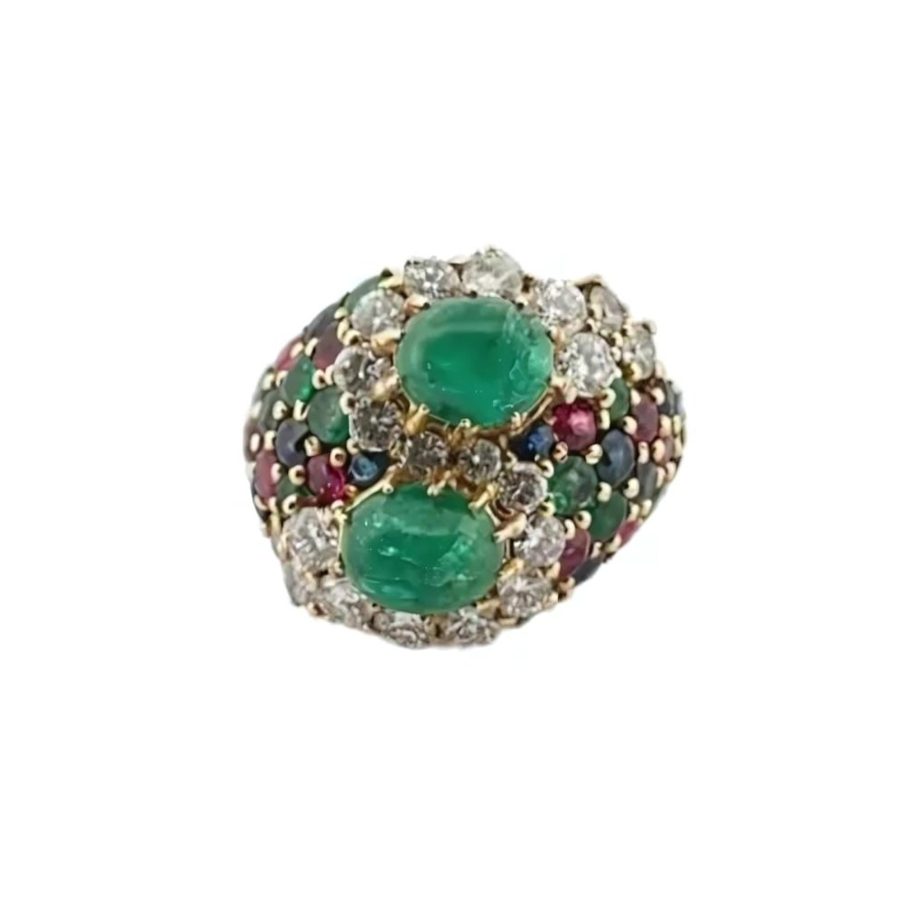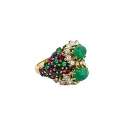 Toi et Moi Cocktail ring in 18-carat yellow gold, decorated with emeralds, rubies and diamonds.