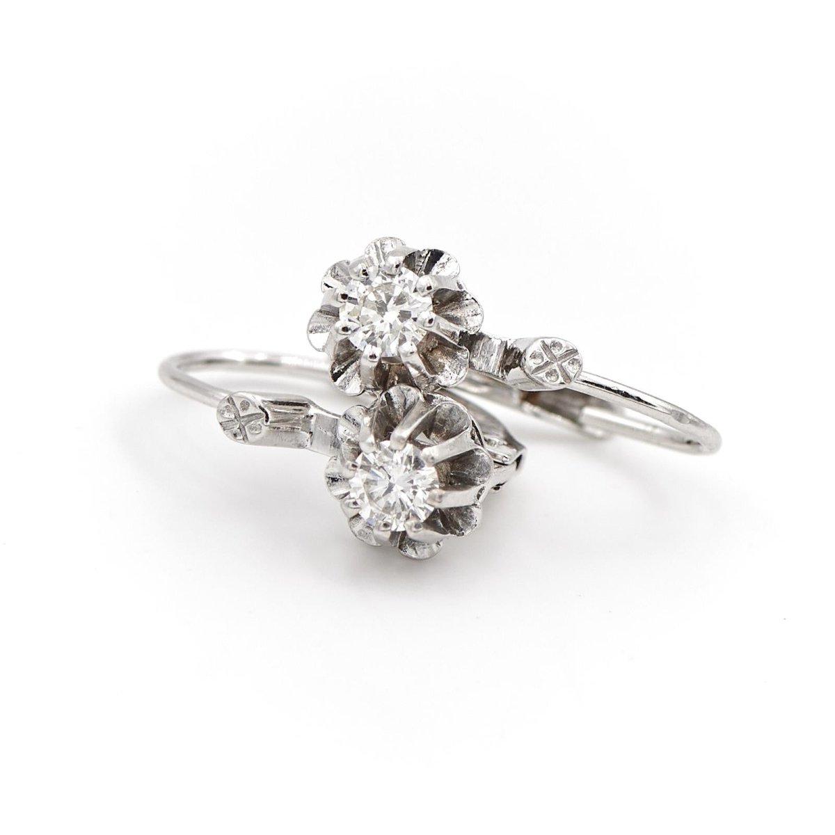 Pair of Art Deco sleeper earrings. in 750 thousandths (18 carat) white gold. set with 2 brilliant-cut diamonds. of approximately 0.17 ct each. total diamond weight: approximately 0.34 ct. dimensions: 1.40 cm x 0.61 cm. total weight: 2.07 g. eagle head hallmark. excellent condition