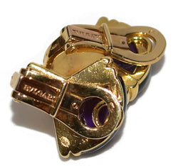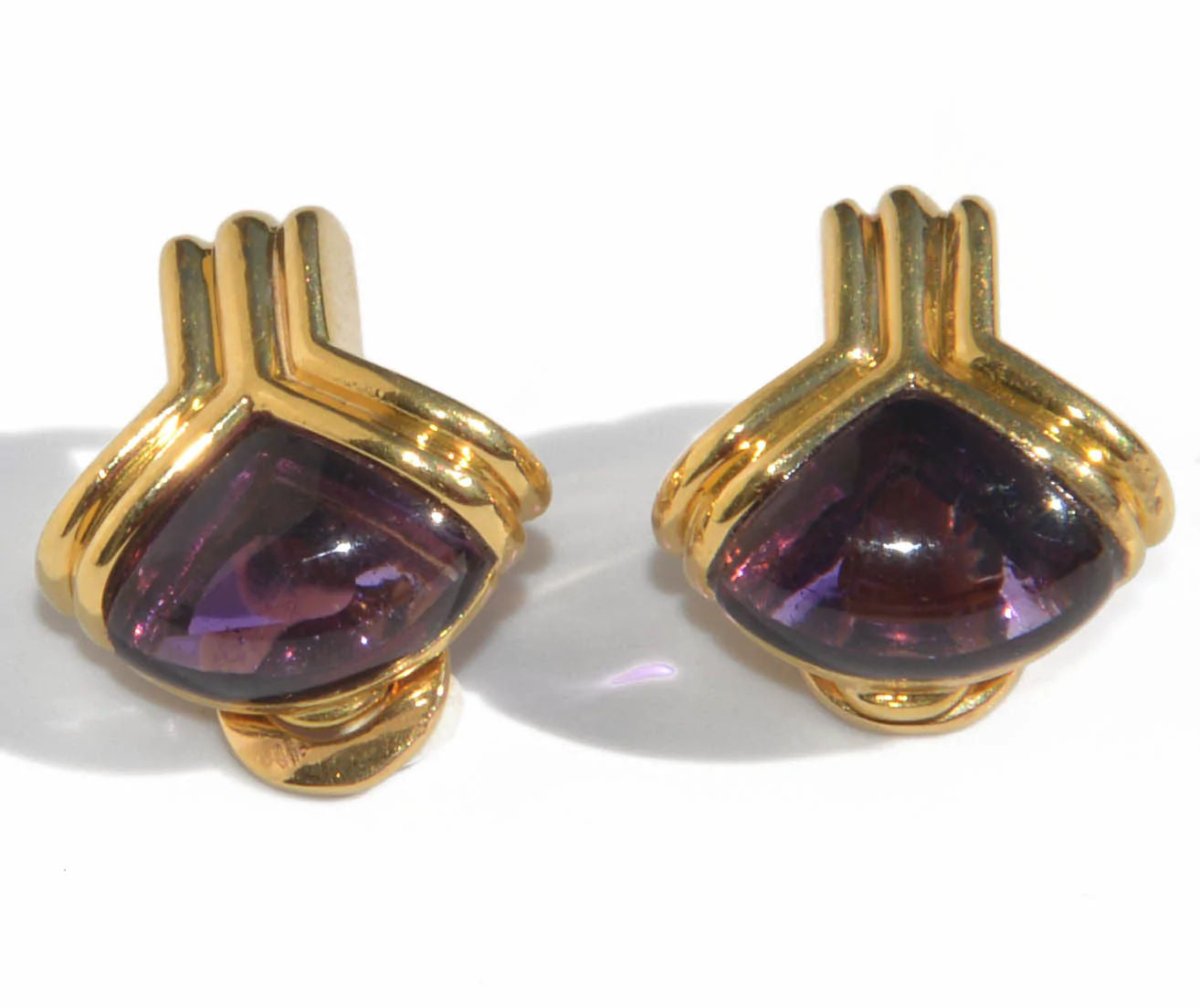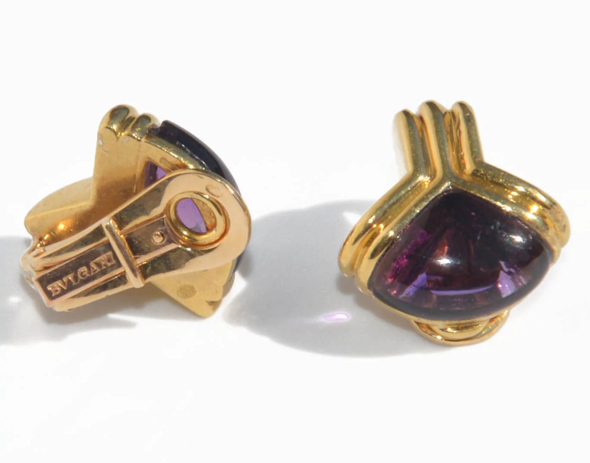 Yellow gold earrings from Bvlgari, decorated with 2 cabochon amethysts forming a triangle on a gadrooned gold motif. Material: 18k yellow gold Hallmark: Signature Weight: 18 grams Length: 1.5cm Width: 1.5cm For non-pierced ears modifiable: Stone: Amethyst Period: 1990