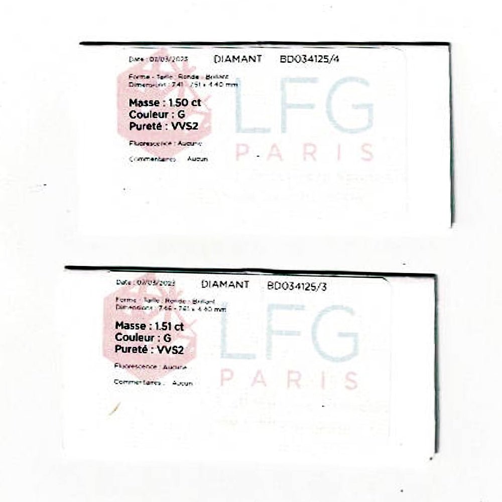 A pair of ear studs attributed to Maison Cartier in 750/000 white gold each set with brilliant-cut diamonds. One of 1.50 carats and the other of 1.51 carats. LFG reviews: both diamonds have a G/VVS2 quality. io Weight: 2.8 grams Diamond weight: 1.50 cts and 1.51 cts.