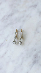 18kt yellow gold and platinum sleeper earrings (hallmarks: eagle's head) adorned with an old-cut diamond topped with an alignment of rose-cut diamonds Total diamond weight estimated at approximately 0.20 Ct. Fixed pendant. French work, Circa 1910. Numbered frame. Gross weight: 2.37 g Total height: 2.00 cm Width: 0.50 cm Condition: very light micro scratches on the gold and platinum parts, light shocks and losses on the diamonds, see photos. All our antique earrings.