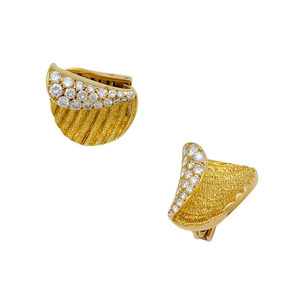 A pair of earrings in 750/000 yellow gold, made of curved textured round motifs and partially set with brilliant-cut diamonds. Length: 22mm Width: 17mm Height: 12mm Weight: 20.7 grams Diamond weight: approximately 0.80 carat