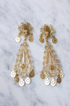Long pair of 18kt yellow gold drop earrings (hallmark: owl) watermarked, decorated with starry pendants. Clip system. Vintage oriental work. Gross weight: 24.10 g Height: 9.00 cm Condition: very light micro scratches and shocks on the gold parts, see photos. These superb gold earrings come from North Africa, and carry within them all the refinement of Berber culture. Discover the story of this pair of earrings worthy of a tale from the Arabian Nights: From the Orient to Hollywood, part 1 All our antique earrings.
