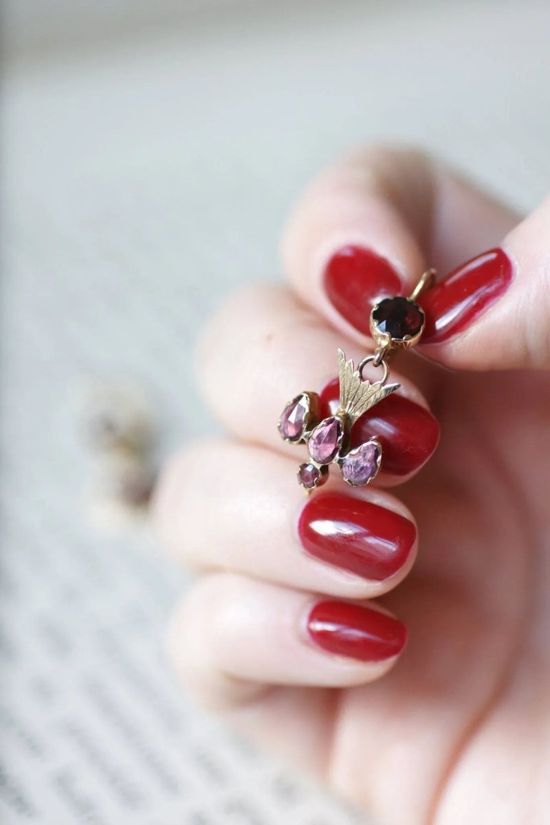 Dangling earrings in 18kt pink gold (hallmark: eagle's head) adorned with a pendant representing a dove, all set with Perpignan garnets mounted on a paillon. Work from the south of France (Languedoc-Roussillon), Victorian era, second part of the 19th century. Gross weight: 3.19g Total length: 3.40 cm Height of the dove: 1.70 cm Dove width: 1.40 cm Condition: very slight micro scratches, shocks and dents on the gold parts, color variations of the garnets, see photos. Did you know that this type of ancient jewelry is inspired by the dove of the Holy Spirit ? Garnet, January's birthstone, is also suitable for those with a grenadine heart. Garnet deposits are found in France, in the Pyrénées-Orientales. Perpignan represents! Find our complete selection of garnet on our article . All our antique earrings.