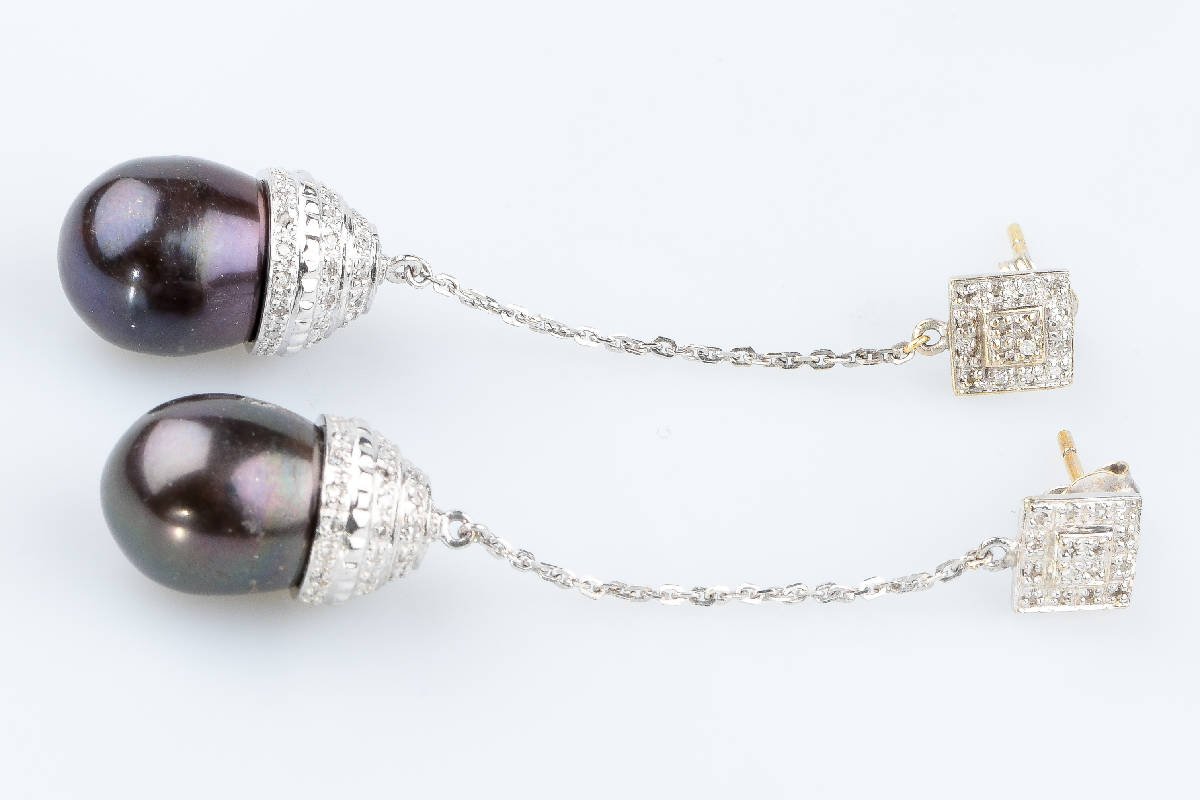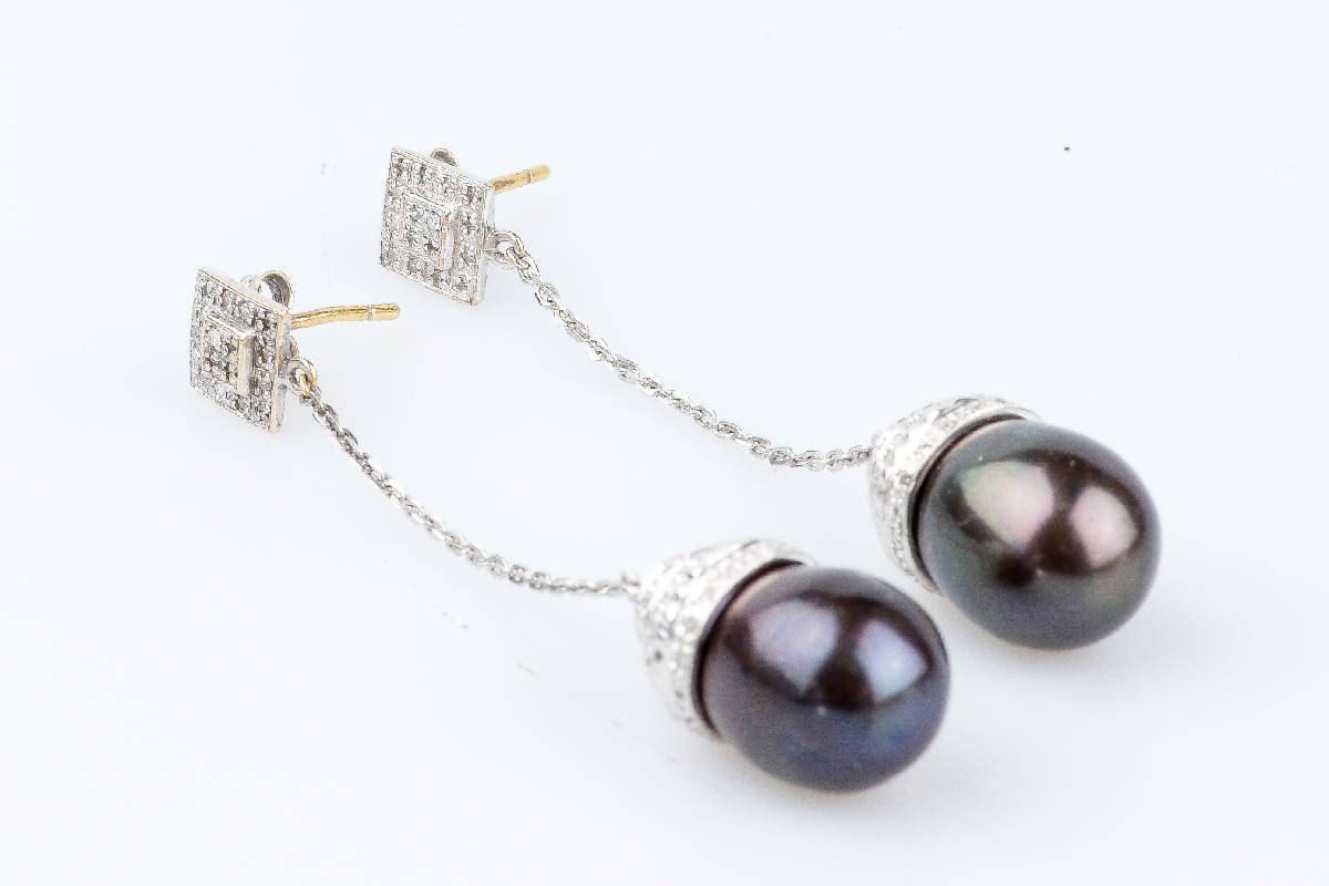 Dangling earrings in 18-carat white gold adorned with 2 gray Tahitian pearls, supported by 140 round brilliant diamonds of 0.01 carats, or 1.40 carats in total. Diamond quality: Color: H Clarity: SI Weight: 11.20 g. Dimensions: Gray pearl decorated with diamonds: 1.80 x 1.20 cm Dangling earring: 5.70 x 0.17 cm 18 carat gold hallmark marked on the jewel. Condition: like newJewel delivered in a luxurious box with a certificate of authenticity.