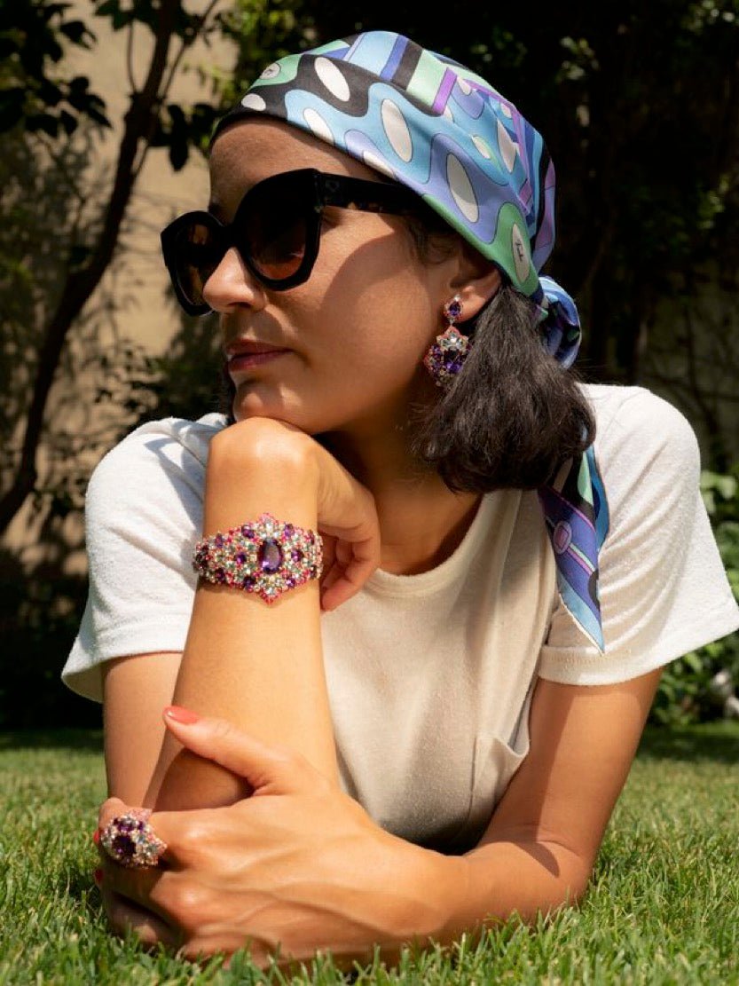 Bracelet in yellow gold, amethysts, diamonds, pink sapphires and topaz