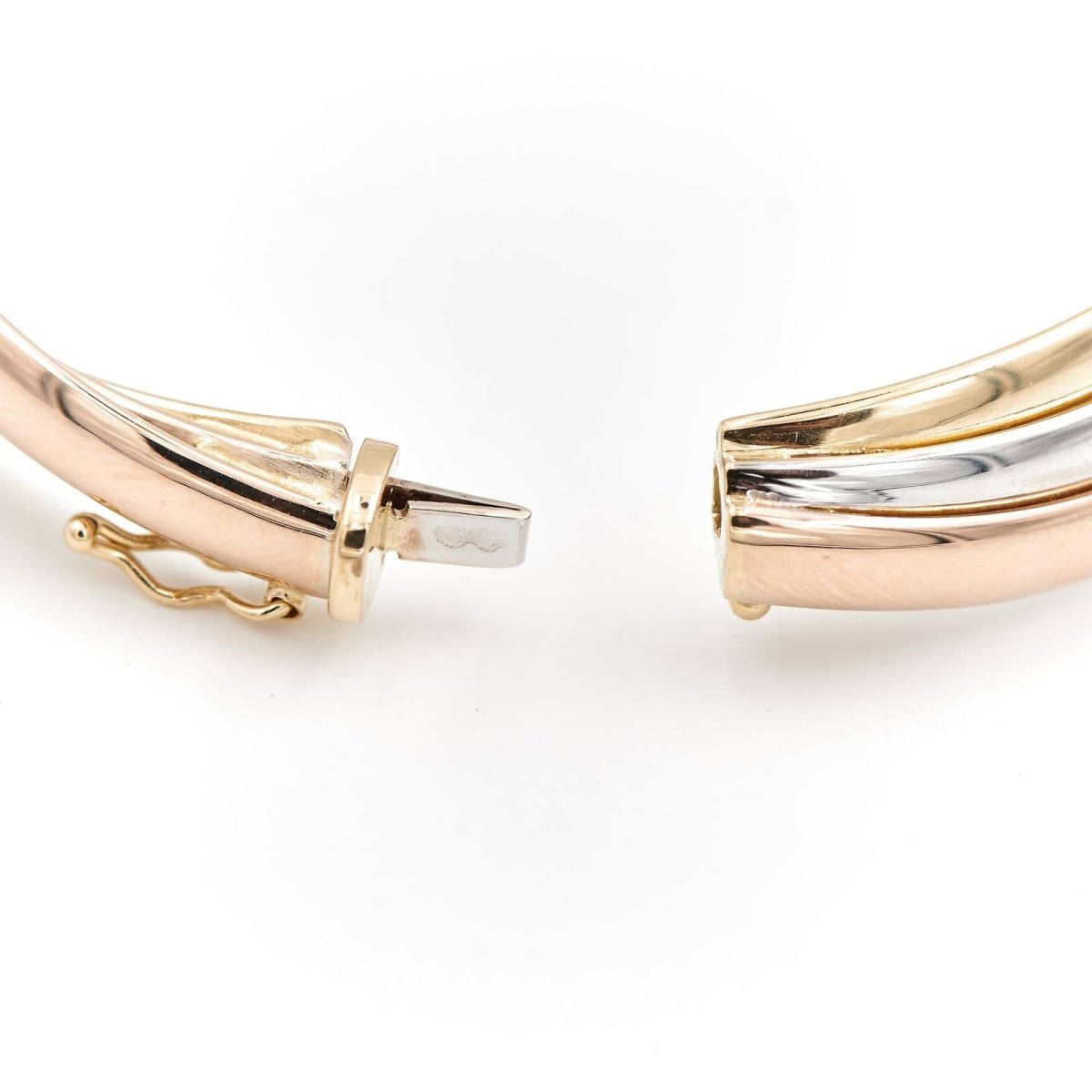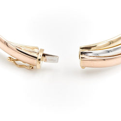 Three 750 thousandths (18 carat) gold bangle bracelet. interior dimensions: 5.00 cm x 5.91 cm. length: 17cm. width on top: 1.21 cm. safety eight. total weight: 17.07 g. eagle head hallmark. excellent condition