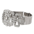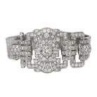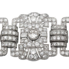 Art Deco bracelet 750 thousandths white gold (18 carats) and 950 platinum. set with a central old-cut diamond. with a weight of approximately 0.85 ct. 2 baguette-cut diamonds. each with a weight of approximately: 0.15 ct. and old cut diamonds. total weight of diamonds: approximately 11.17 cts. length: 20 cm. clip clasp adjustable to 3 notches. width: 3.38 cm. total weight: 67.24 g. owl punch. excellent condition