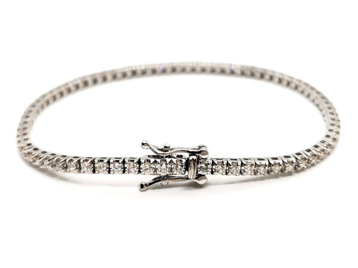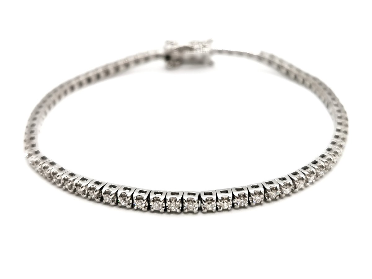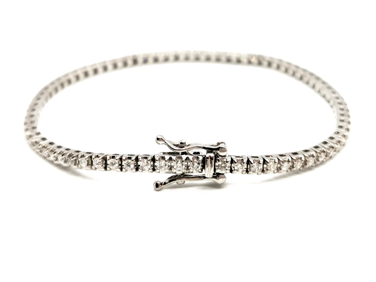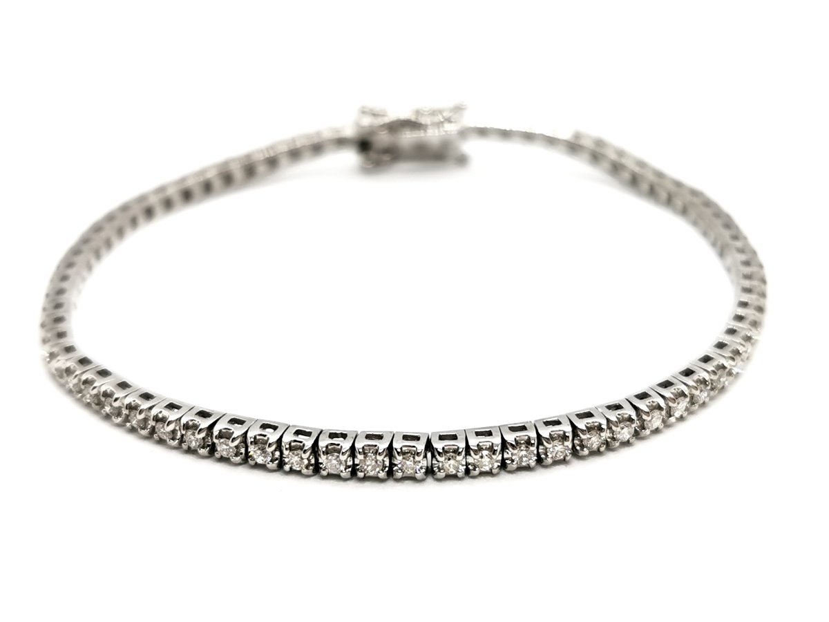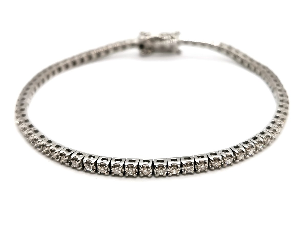 Diamond line bracelet. in 750 thousandths (18 carat) white gold. set with 71 diamonds. brilliant cut. for a total of 0.98 ct. length: 16.5cm. width: 0.25 cm. clasp with double figure eight safety. total weight: 9.75 g. punched. new condition