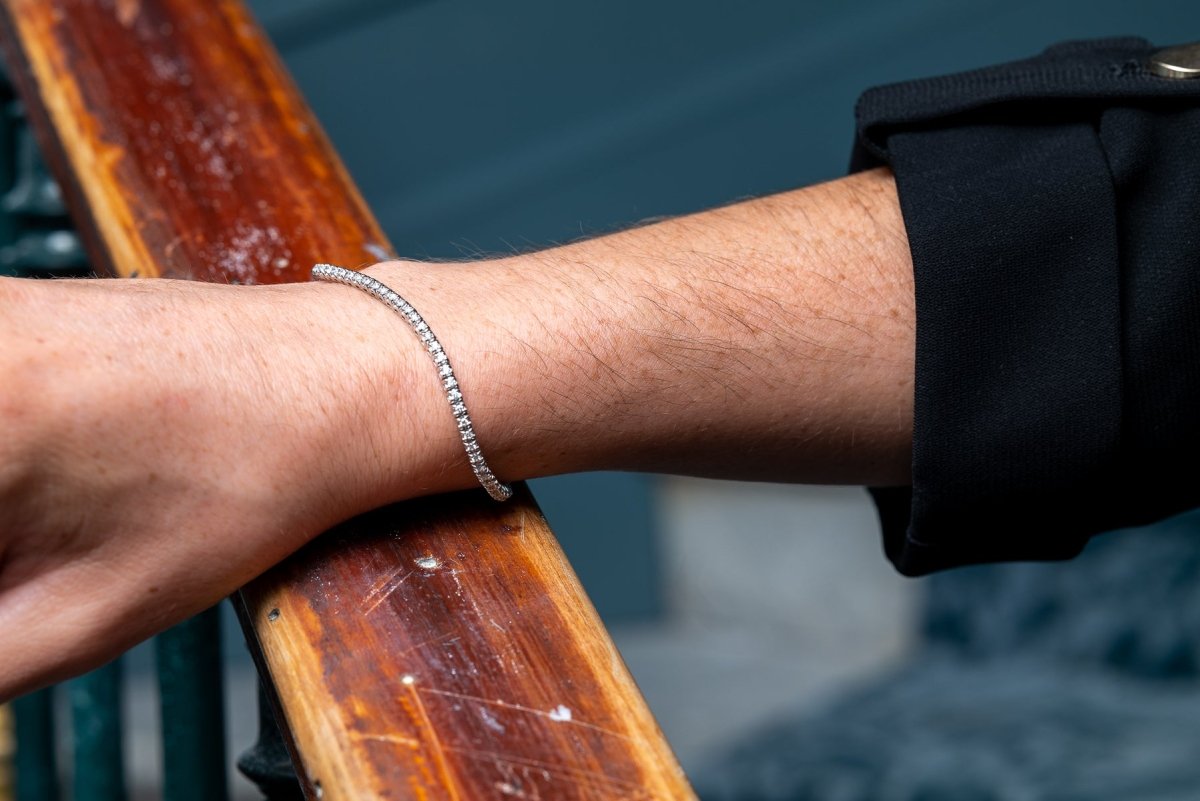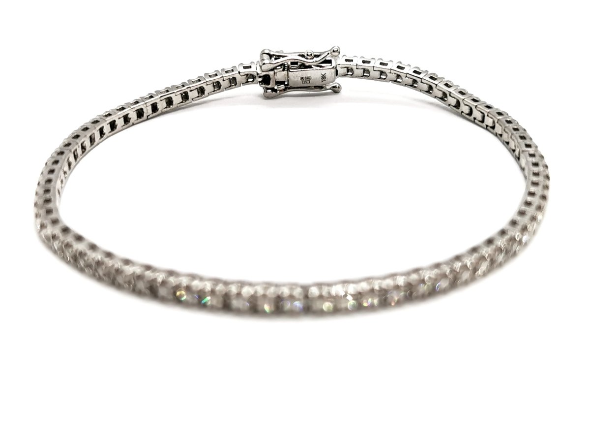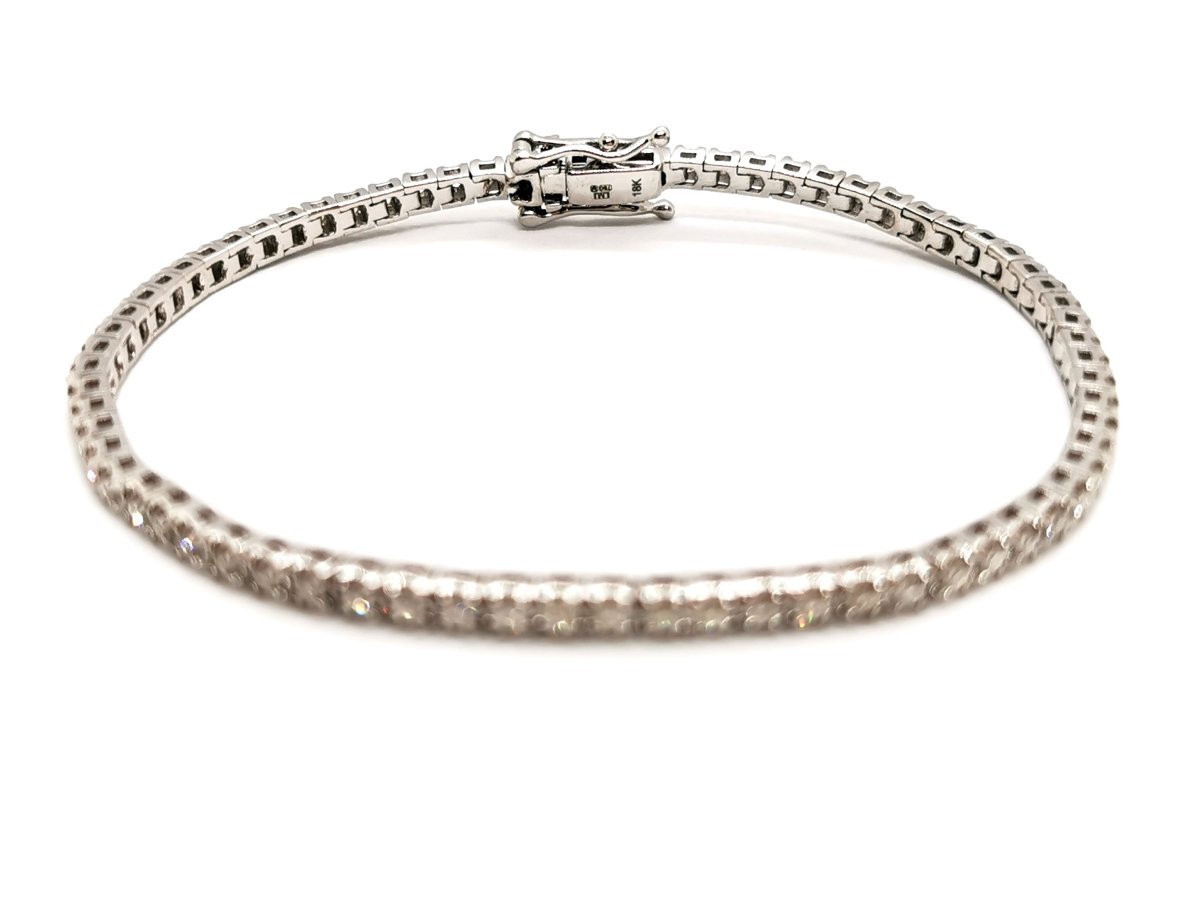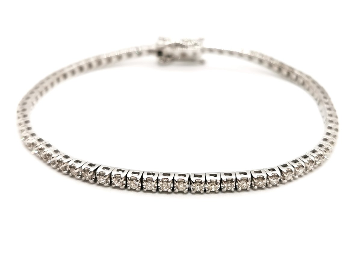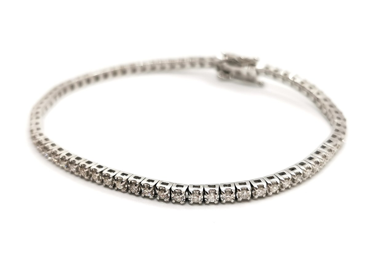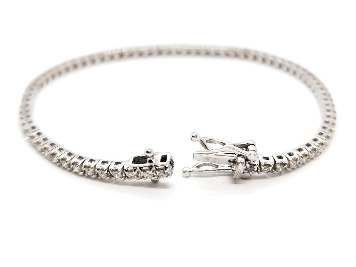 Diamond line bracelet. in 750 thousandths (18 carat) white gold. set with 71 diamonds. brilliant cut. for a total of 0.98 ct. length: 16.5cm. width: 0.25 cm. clasp with double figure eight safety. total weight: 9.75 g. punched. new condition