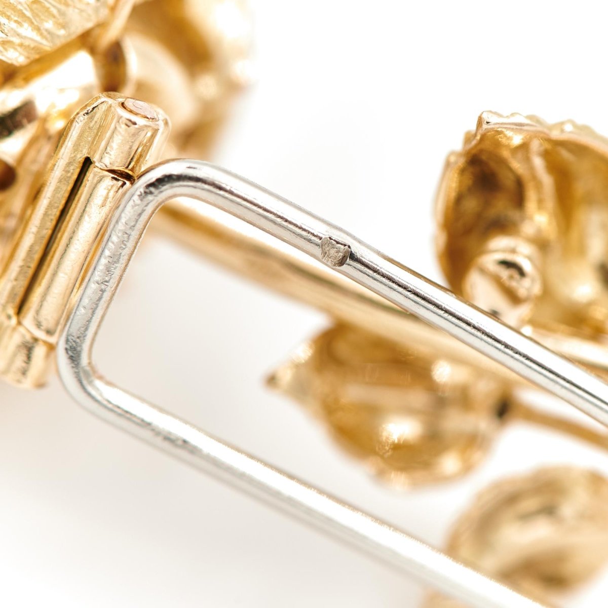 Brooch in 18-carat yellow gold depicting a flower whose petals are articulated and open. The pistiles also move and are set with brilliant-cut blue sapphires. Total weight: 18.56 g Total weight of sapphires: 0.24 carat Length: 5.05cm Thickness: 2.25cm Diameter of closed flower: 2.03 cm Diameter of open flower: 3.35 cm Hallmark: eagle head