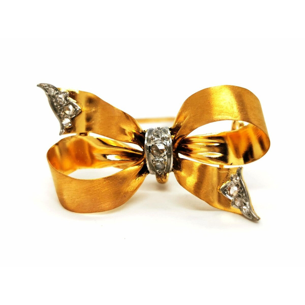Bow brooch in 18k yellow and white gold. Yellow gold is worked in matte and shiny. The jewelry is adorned with 11 rose-cut diamonds set in white gold. Total weight: 5.49g Total diamond weight: 0.066 carat Dimensions: 3.55 cm x 1.92 cm Hallmark: eagle head