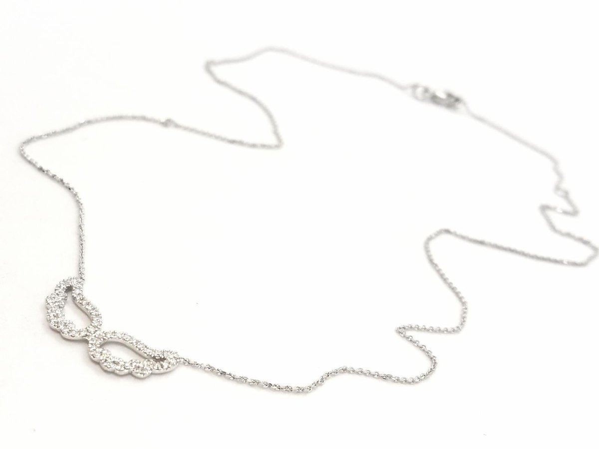 18-carat white gold necklace with an angel wings pendant paved with brilliant-cut diamonds for a total of 0.23 carats. The chain is made of 0.7 mm wide convict mesh. Total weight: 2.49g Chain length: 42 cm with intermediate ring at 38 cm Pattern dimensions: 2 cm x 0.65 cm Hallmark: eagle head