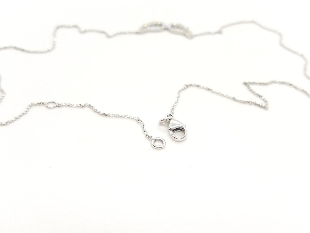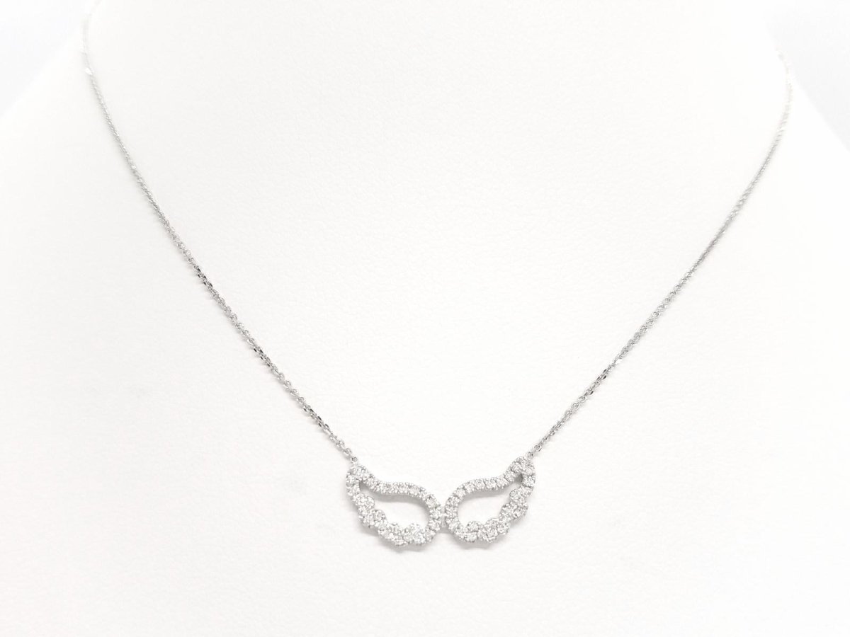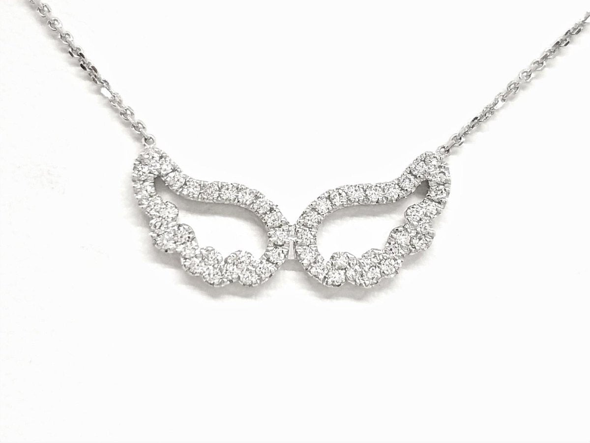 18-carat white gold necklace with an angel wings pendant paved with brilliant-cut diamonds for a total of 0.23 carats. The chain is made of 0.7 mm wide convict mesh. Total weight: 2.49g Chain length: 42 cm with intermediate ring at 38 cm Pattern dimensions: 2 cm x 0.65 cm Hallmark: eagle head