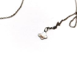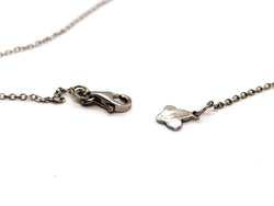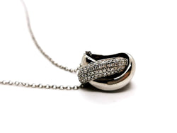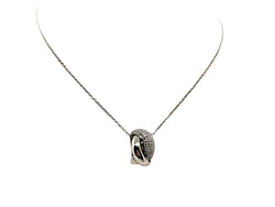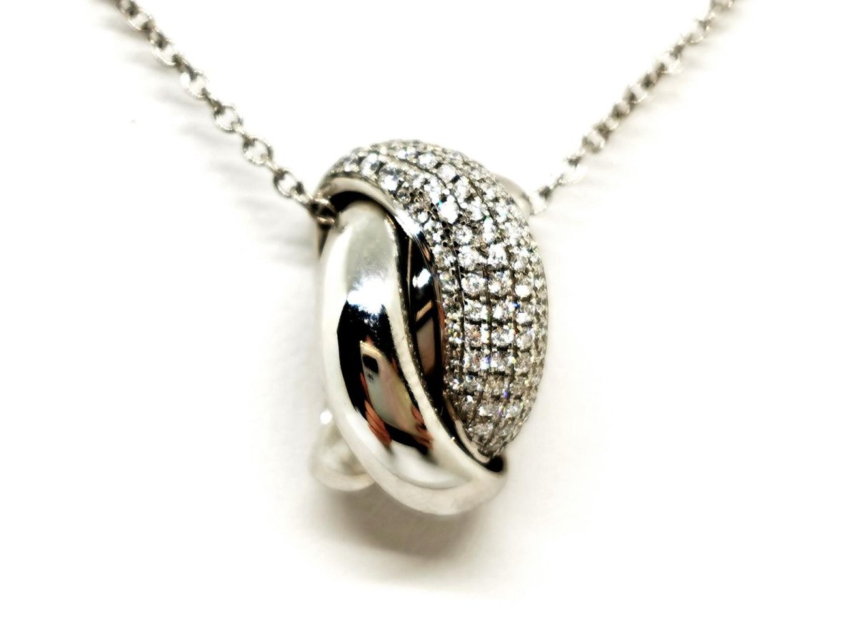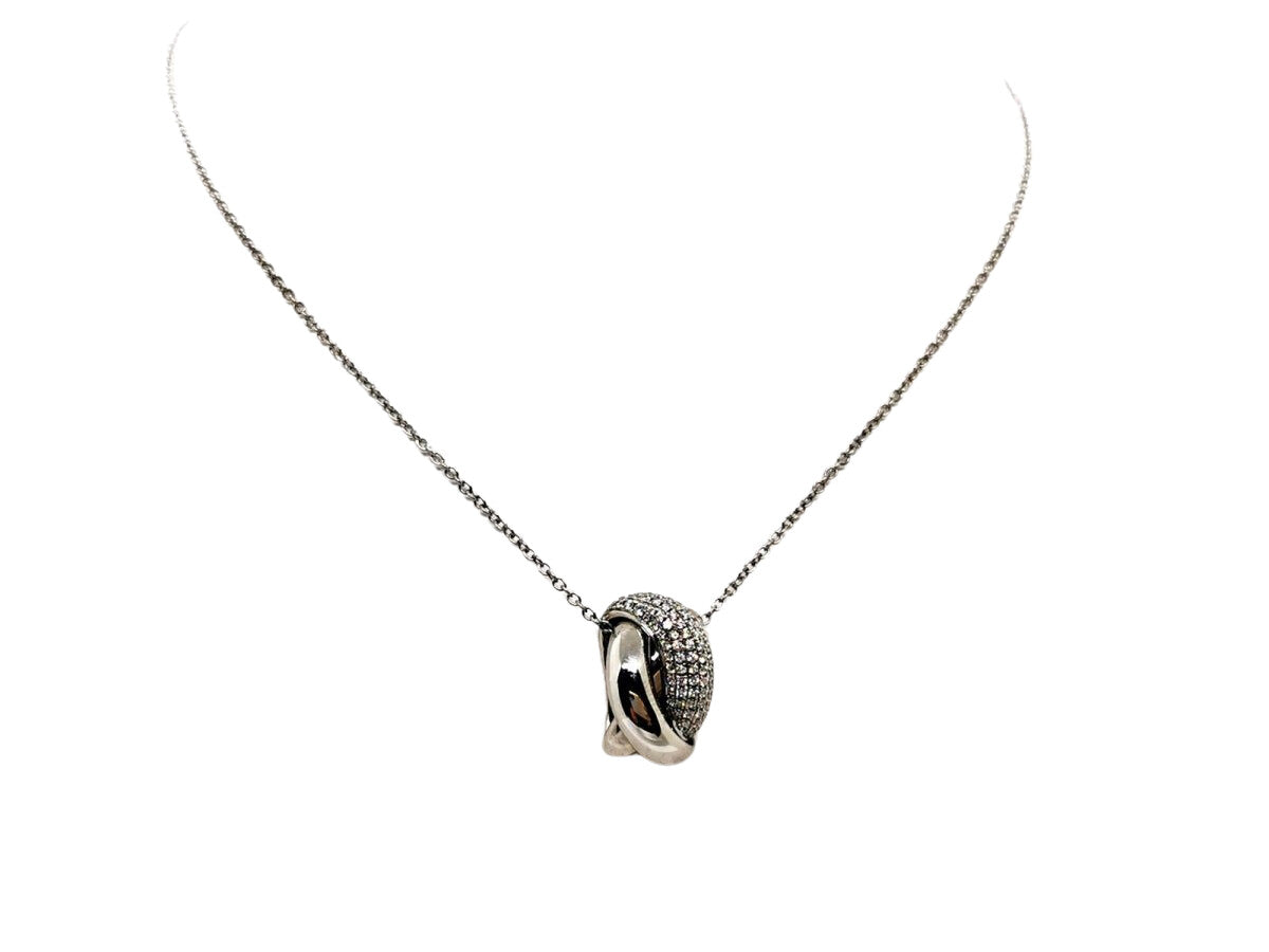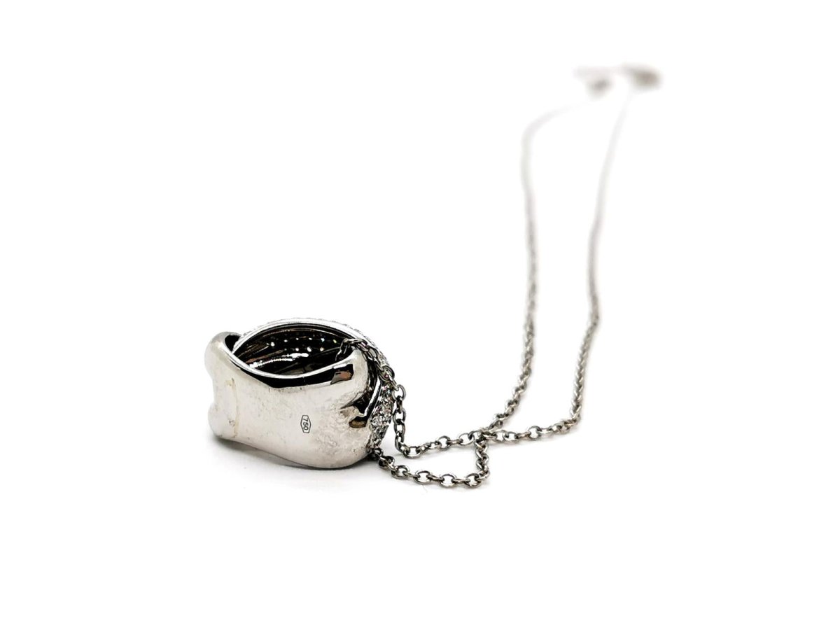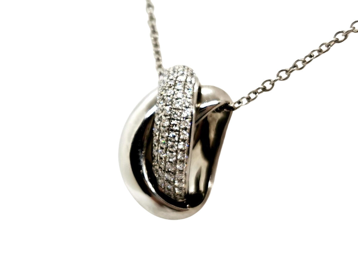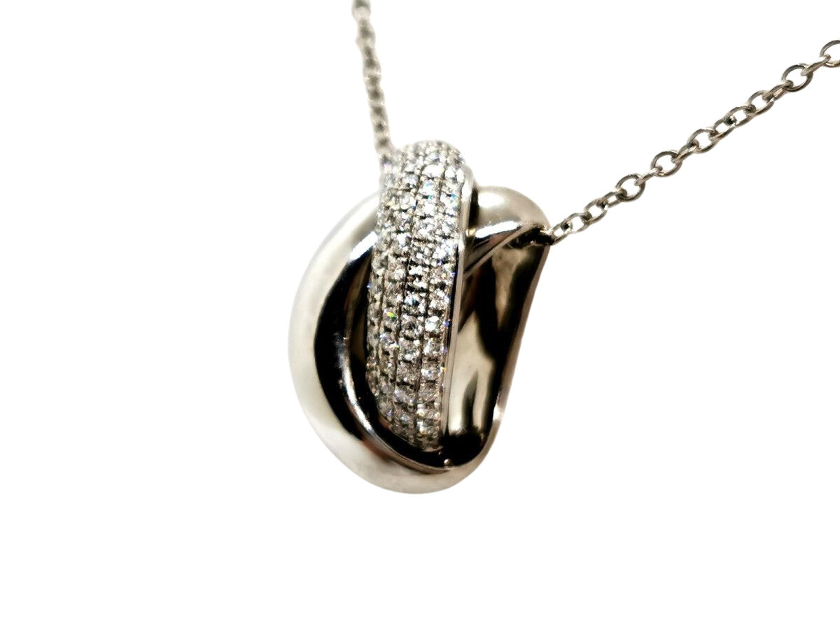 Necklace in 750 thousandths 18-carat white gold signed by jeweler Piero Milano. Composed of a cable link chain and an interlaced pattern pendant paved with 77 diamonds in 5 rows of brilliant-cut diamonds for a total of approximately 0.53 carat. Total weight: 6.61 g Chain length: 42 cm Chain width: 0.12 cm Pendant dimensions: 1.68 cm x 0.91 cm Hallmarked