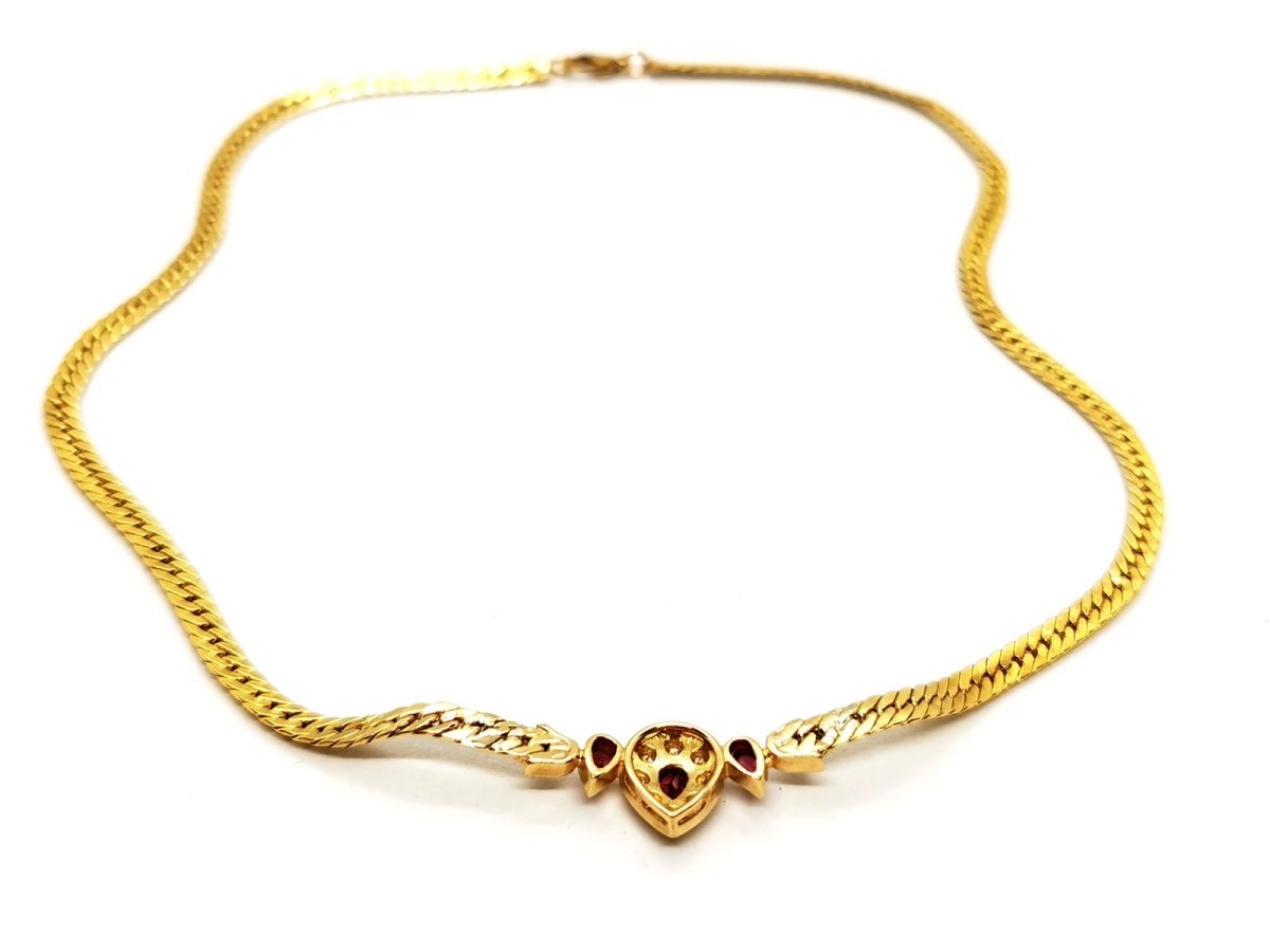 Choker necklace adorned with rubies and diamonds. in 750 thousandths (18 carat) yellow gold. English mesh. 3 pear-shaped rubies. total ruby weight: approximately 0.28 ct. and 12 diamonds of approximately 0.01 each. total diamond weight: approximately 0.12 ct. dimensions of the pattern: 1.09 cm x 2.74 cm. length: 38.5cm. width of the chain: 0.36 cm. total weight: 10.46 g. owl punch. excellent condition