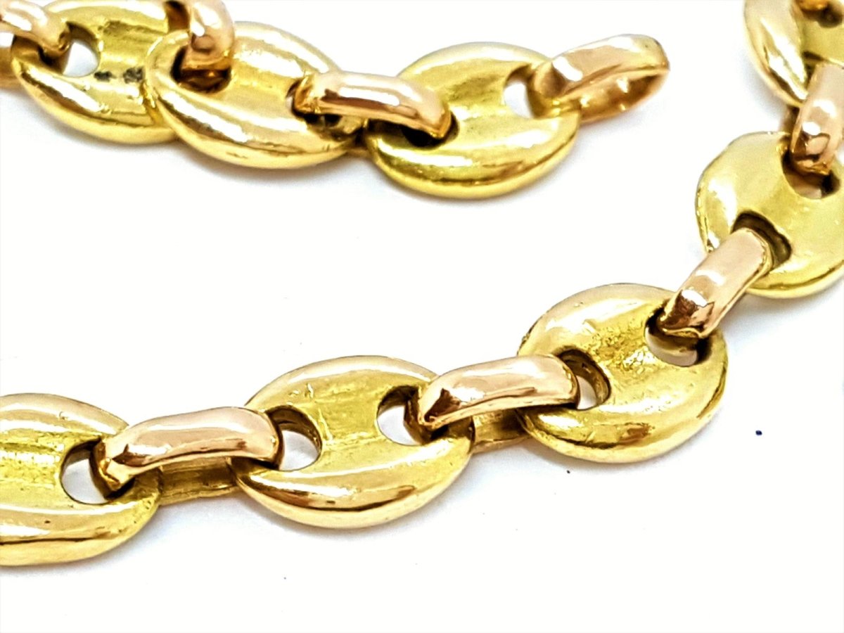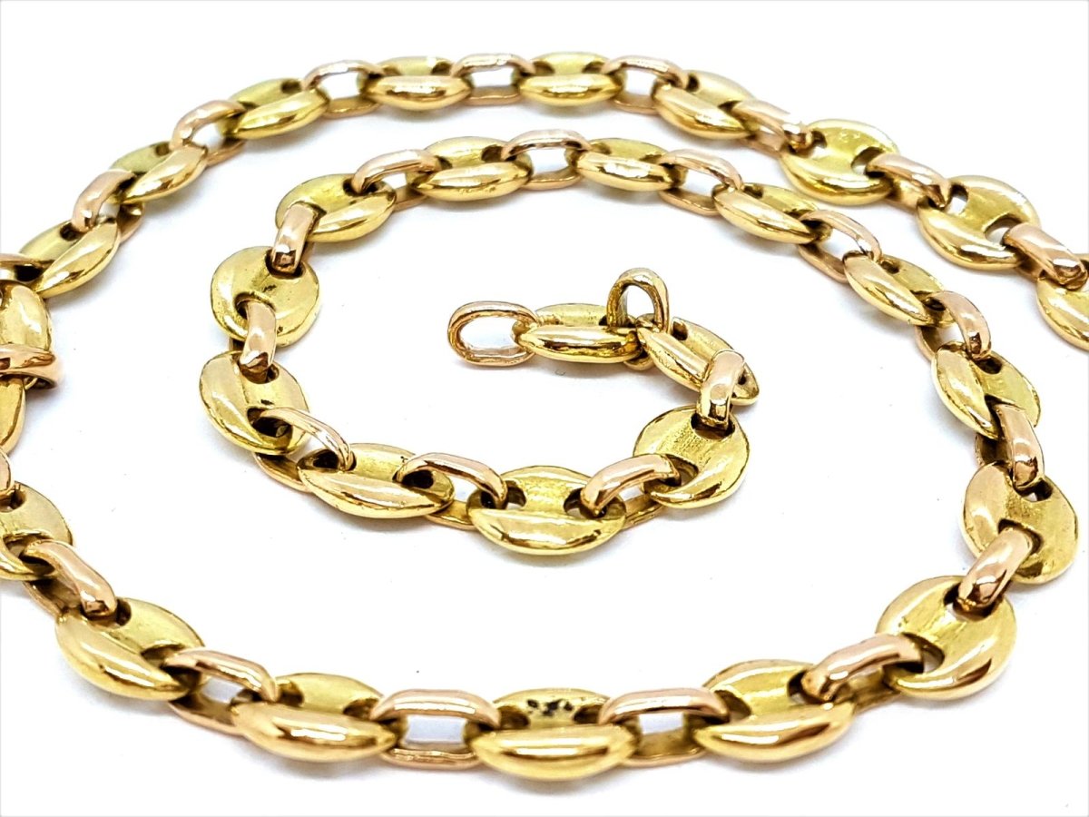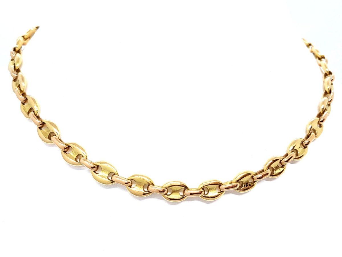 Two-tone necklace in 18-carat yellow gold and rose gold with massive coffee bean mesh. The grain links are in yellow gold and the intermediate rings in pink gold. Weight: 62.80 g Length: 42cm Width: 0.75cm Hallmarked