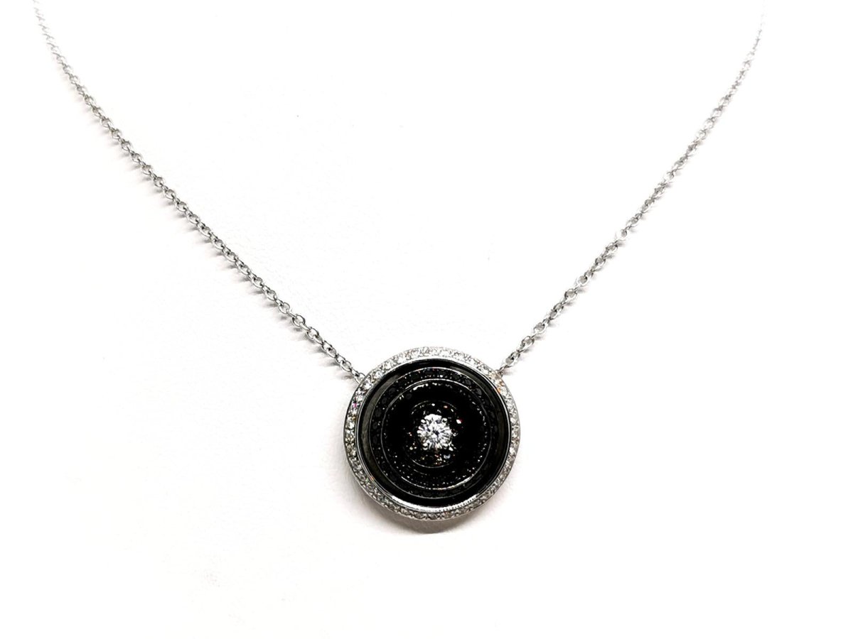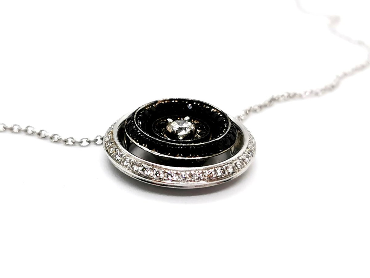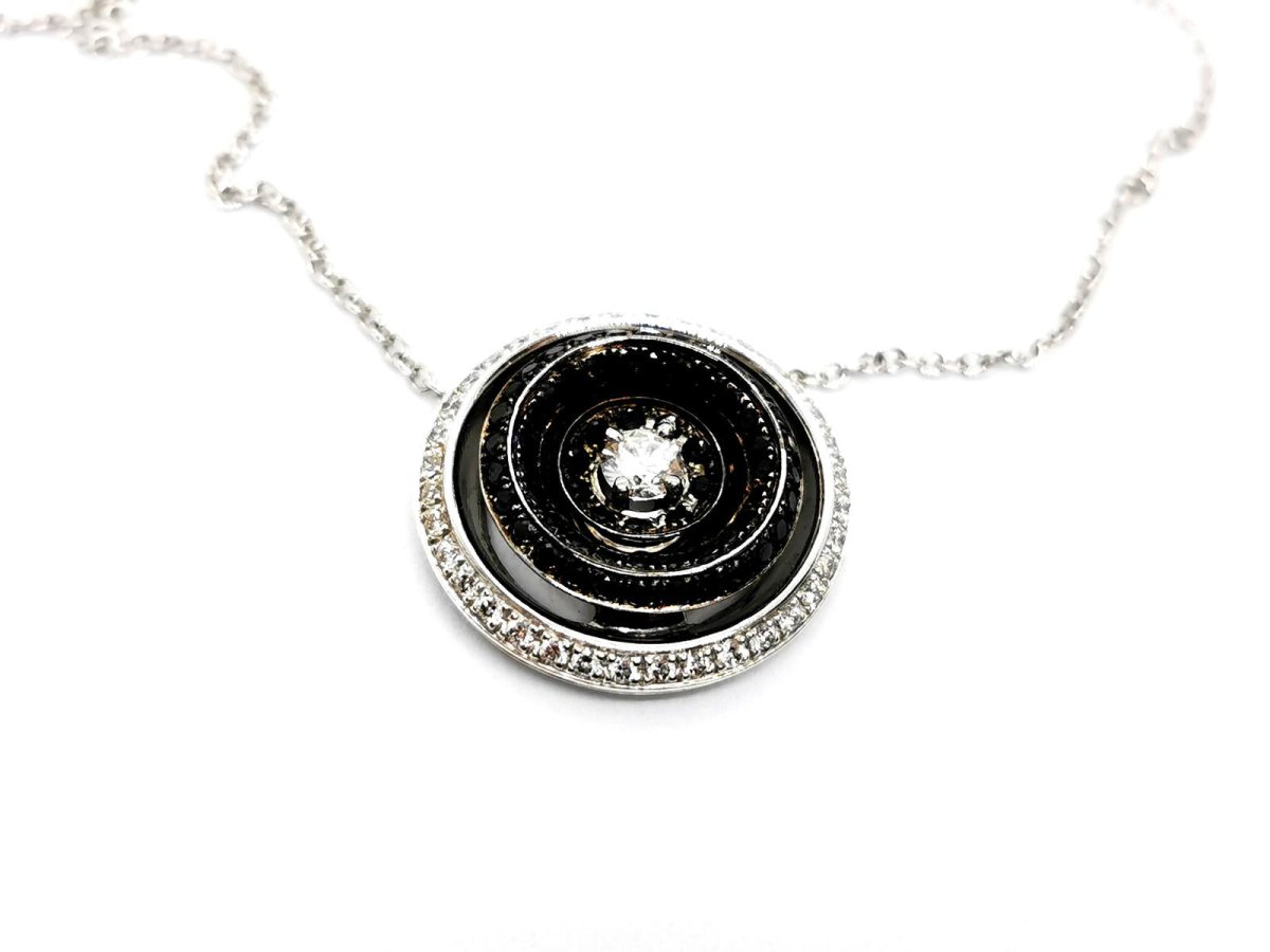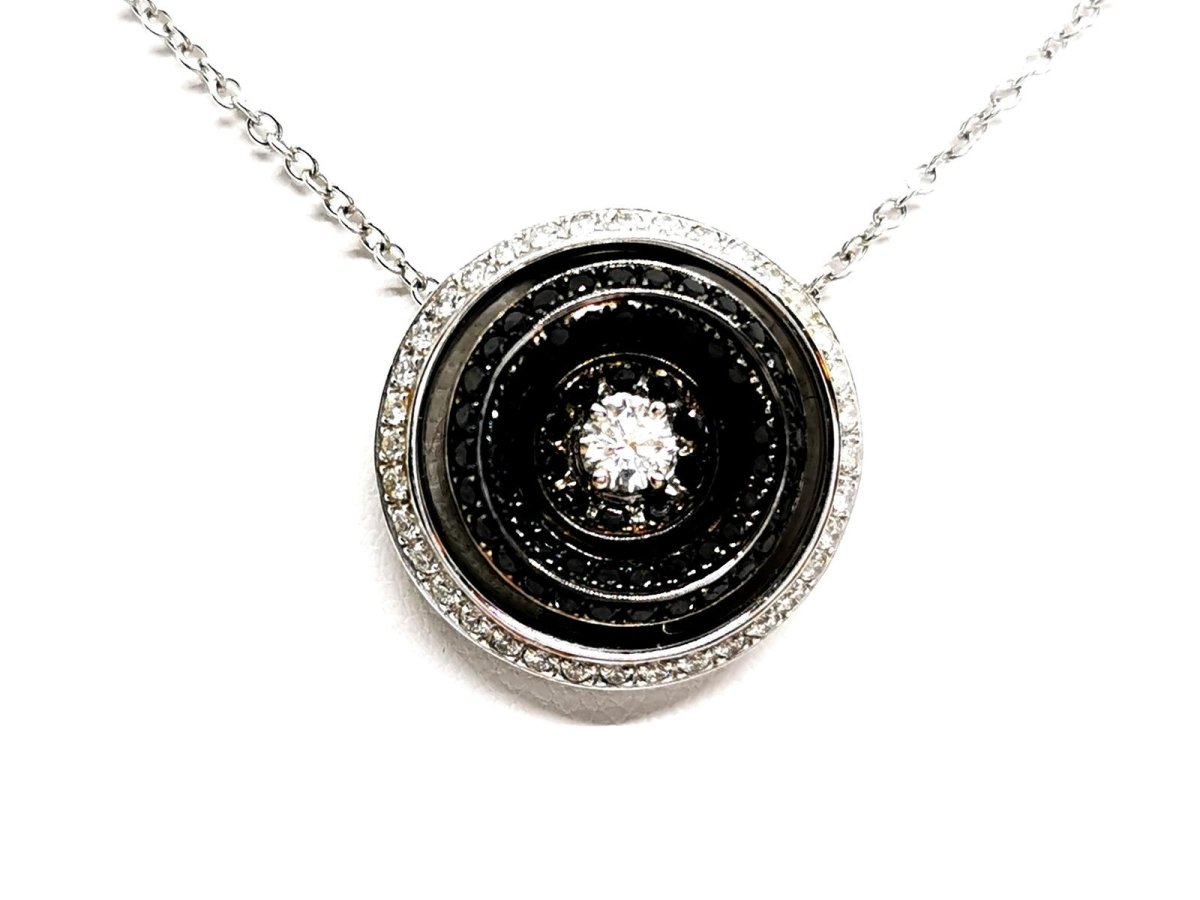 18-karat white gold necklace with round pendant set in the center with a white diamond. brilliant cut of approximately 0.18 carat surrounded by 62 black diamonds for a total of approximately 0.37 carat and 37 white diamonds for a total of approximately 0.22 carat. Total weight: 9.98 g Total diamond weight: 0.77 carat Length: 43 cm with intermediate ring at 41cm Chain width: 0.14 cm Pendant diameter: 2 cm Hallmarked