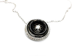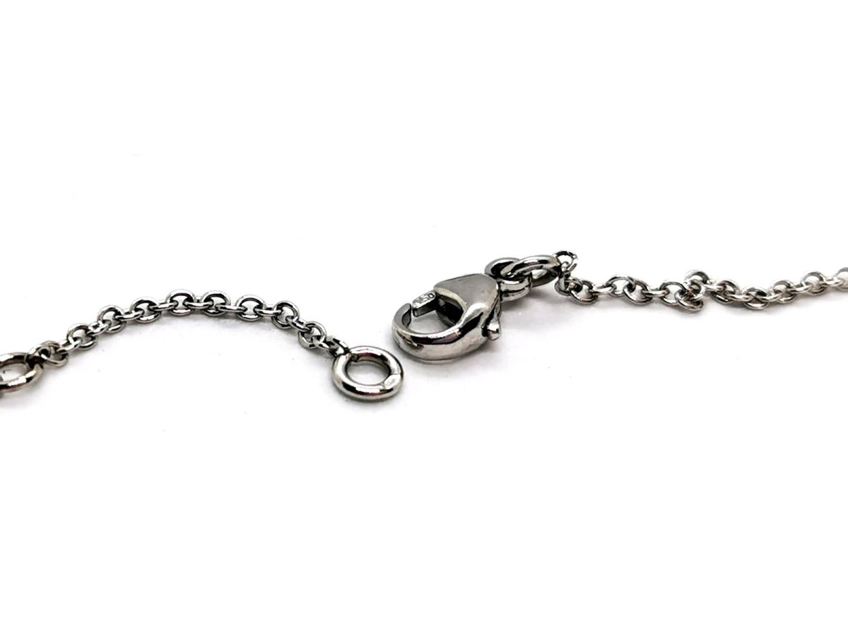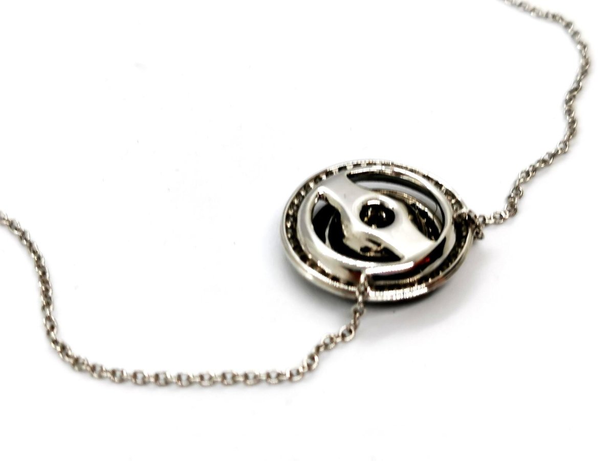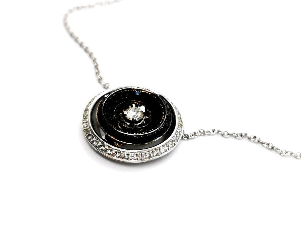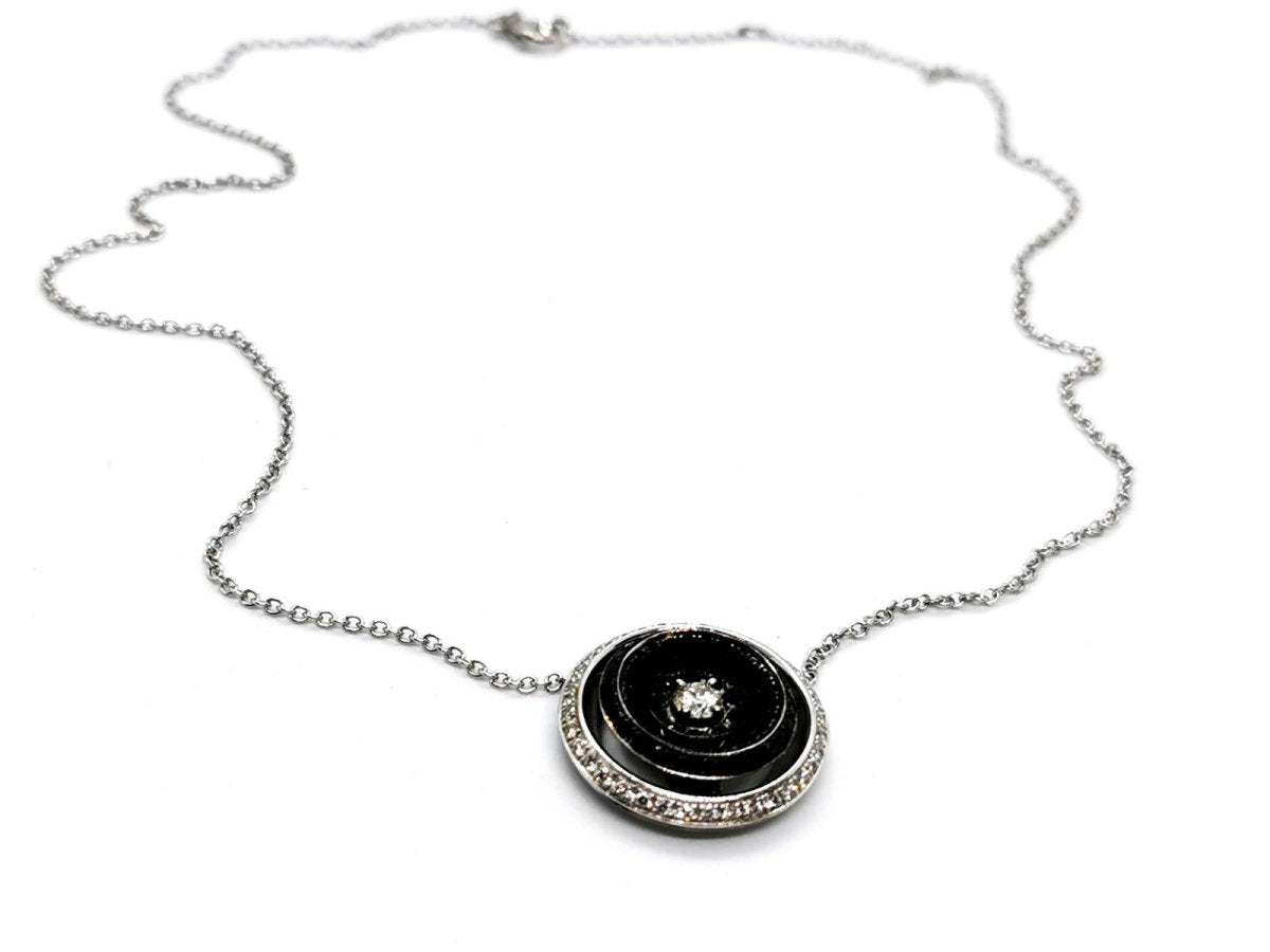 18-karat white gold necklace with round pendant set in the center with a white diamond. brilliant cut of approximately 0.18 carat surrounded by 62 black diamonds for a total of approximately 0.37 carat and 37 white diamonds for a total of approximately 0.22 carat. Total weight: 9.98 g Total diamond weight: 0.77 carat Length: 43 cm with intermediate ring at 41cm Chain width: 0.14 cm Pendant diameter: 2 cm Hallmarked