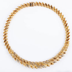 Yellow gold, platinum and diamond necklace from the 1960s forming alternating leaves of diamonds, the gold leaves are chiseled. Material: 18k yellow gold, platinum Hallmark: Eagle head and dog head Weight: 103.72 grams Length: 42grs Width: 1 to 1.5cm Carat number: 1.40 cts Number of stones: 48 Period: 1960
