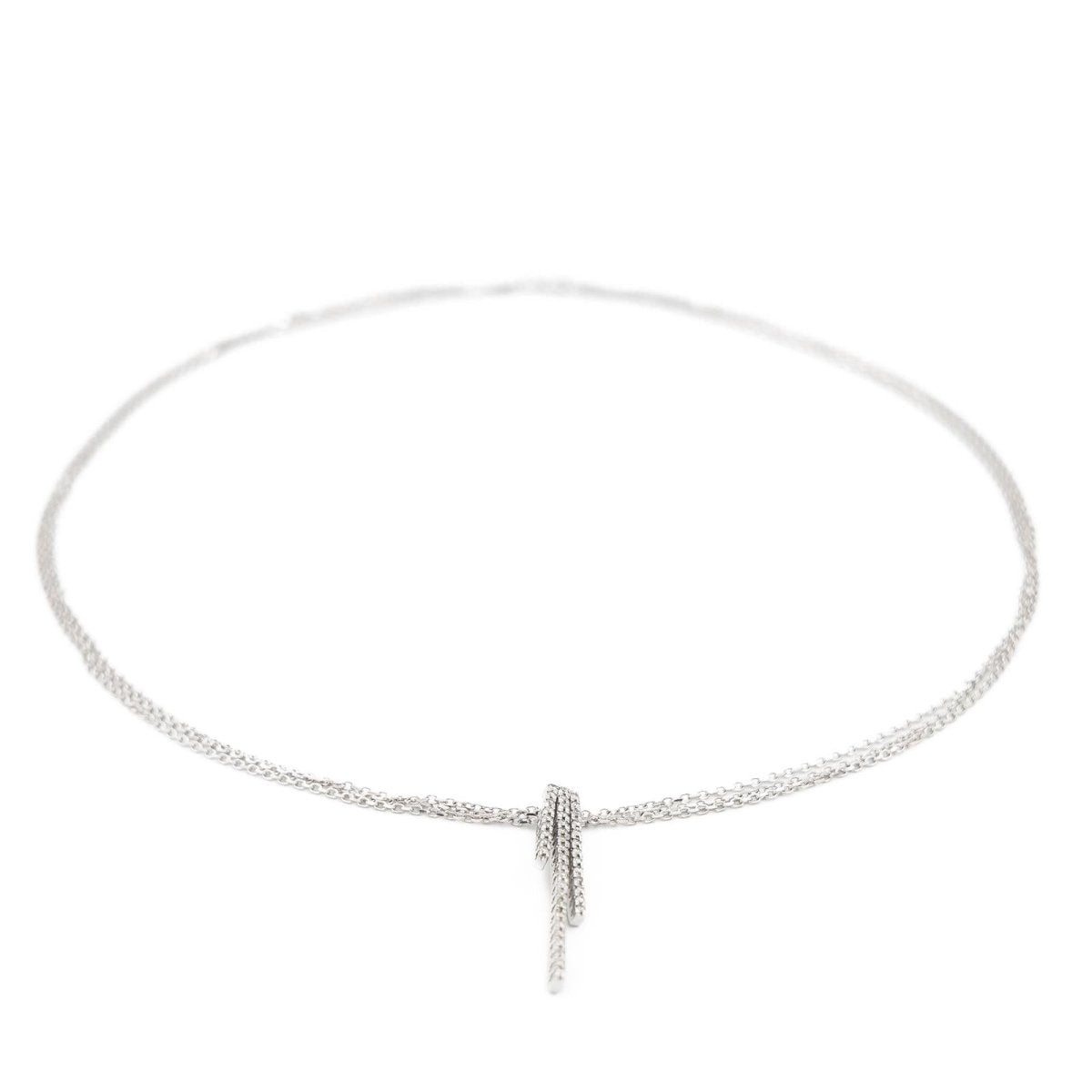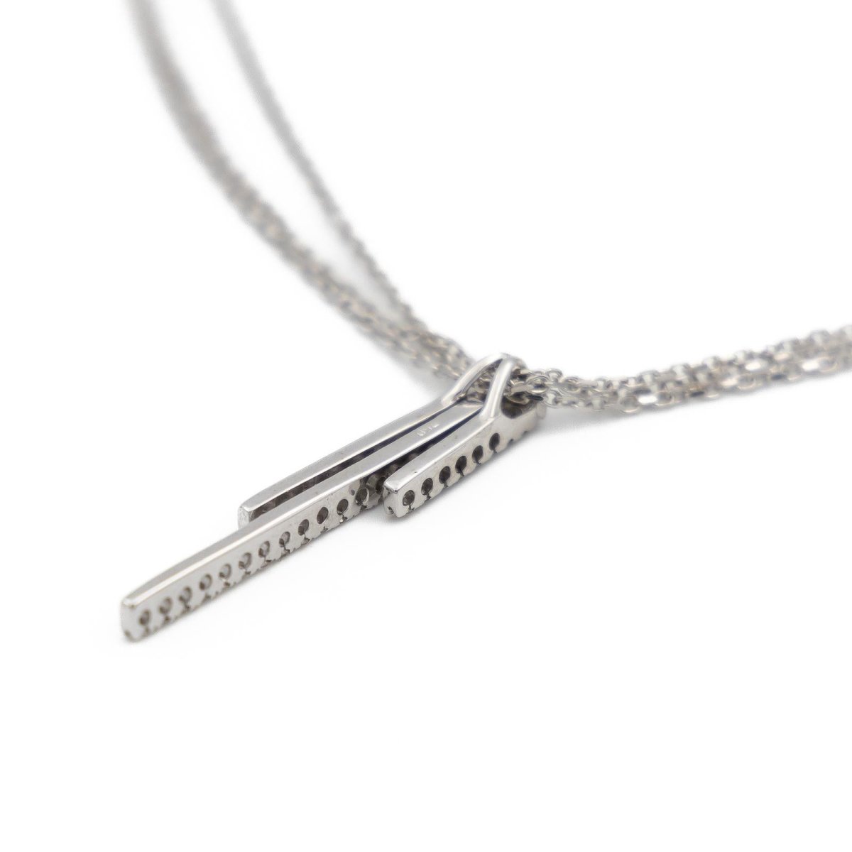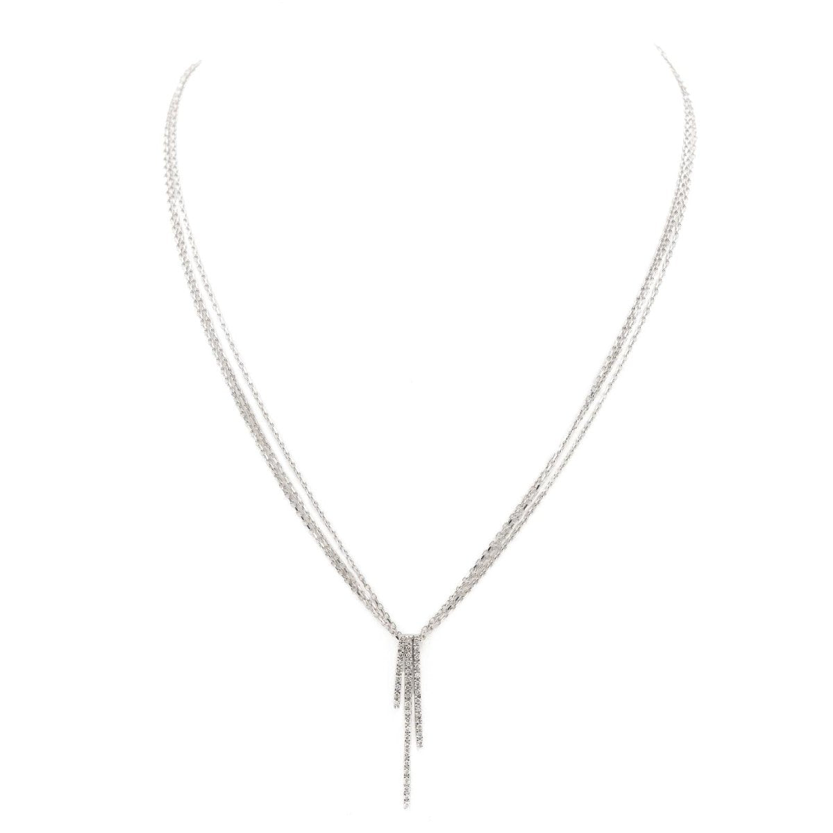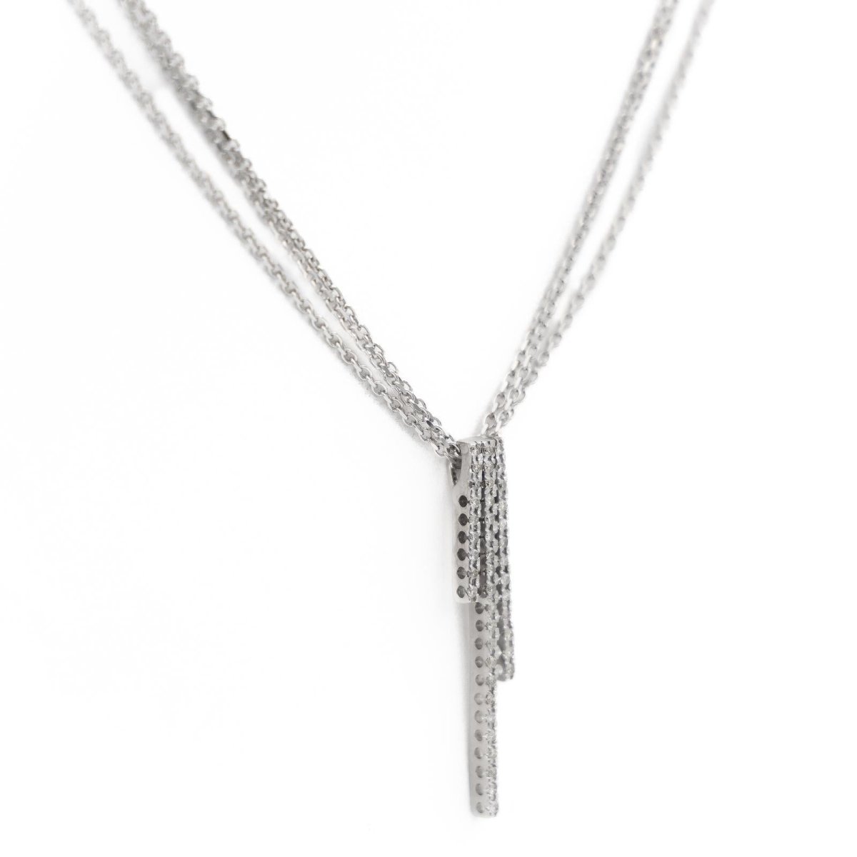 Triple chain necklace in 18-carat white gold with convict link with a pendant composed of 3 baguettes paved with 43 brilliant-cut diamonds. Total weight: 9.56 g Total diamond weight: approximately 0.34 carat Length: 45cm Pendant dimensions: 3.68 cm x 0.6 cm Hallmark: owl