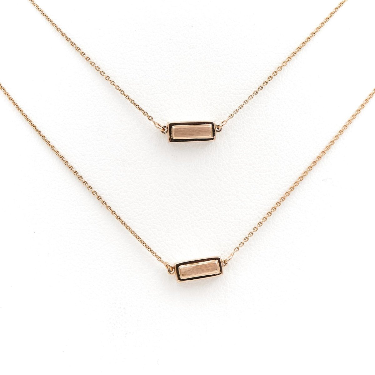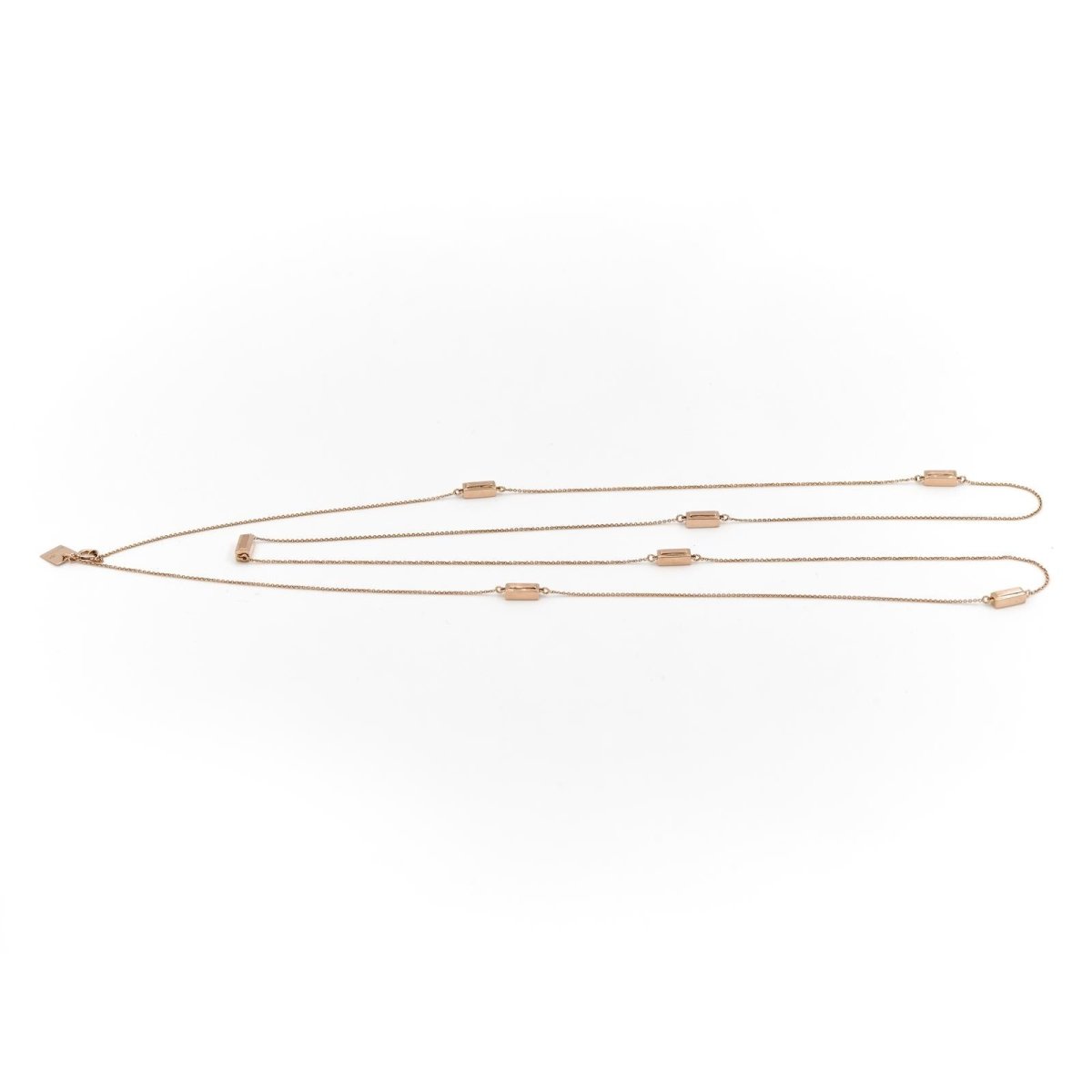 Long necklace signed by GINETTE NY in 18-carat pink gold decorated with 7 rectangular motifs on a thin chain. Total weight: 6.39 g Total length: 80cm Chain width: 0.05 cm Dimensions of a pattern: 0.71 cm x 0.31 cm Hallmark: eagle head