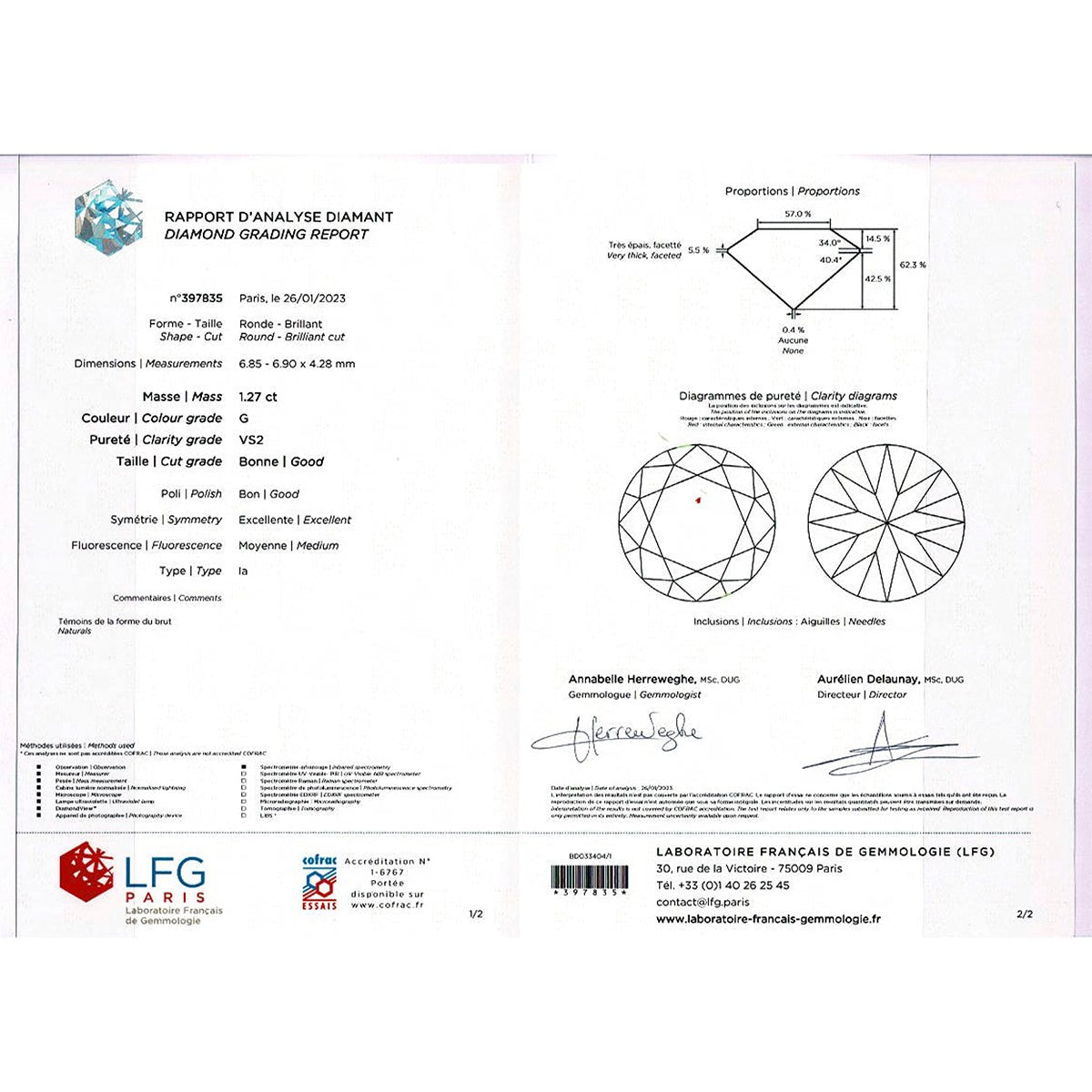A 750/000 white gold necklace composed of a round convict chain adorned with a 1.27 carat brilliant-cut diamond. Diamond quality: G/VS2. LFG certificate. Length: 400-420mm Weight: 7.7 grams Diamond weight: 1.27 ct
