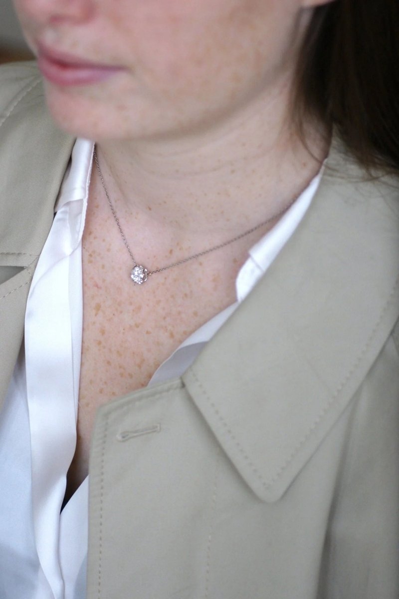 Solitaire diamond brilliant-cut, mounted on a forçat-link chain in white gold 18Kt (hallmark: owl and mascaron). Weight diamond Weight : 1,24Cts diamond accompanied by a gemological report from the LFG (Laboratoire Français de Gemmologie) specifying: H color, SI1 clarity, no fluorescence. Art Deco, 1930s. Gross weight: 3.77 g Pendant height: 1.00 cmWidth of pendant: 1.00 cm Chain length: 43.00 cm Condition: very slight micro-scratches on the gold parts of the setting, see photos. Le diamondlike gold, withstands high temperatures. To clean your ring, we recommend immersing it in hot water with a little washing-up liquid, then scrubbing it gently with a toothbrush. Find out more about jewelry care in our newsletter! All our antique necklaces.