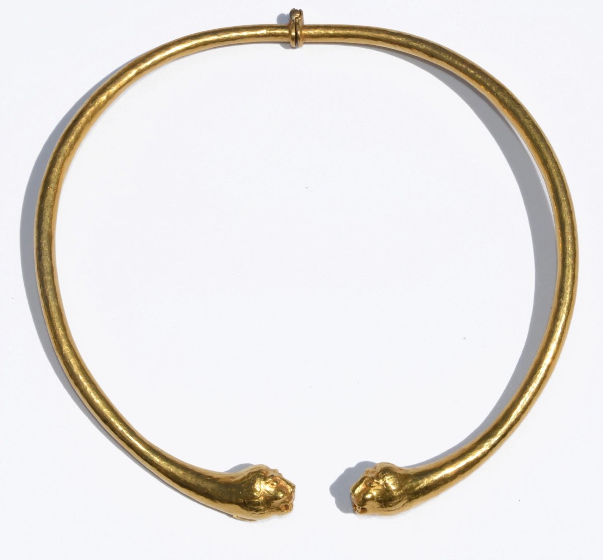 Zolotas necklace in 22k hammered yellow gold opening ending with two lions' heads. Material: 22k yellow gold Hallmark: Signature Weight: 69.5 grams Diameter: 14 cm Period: 1970