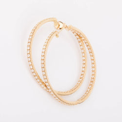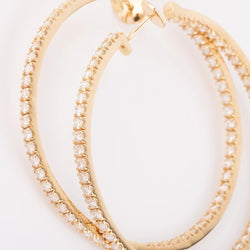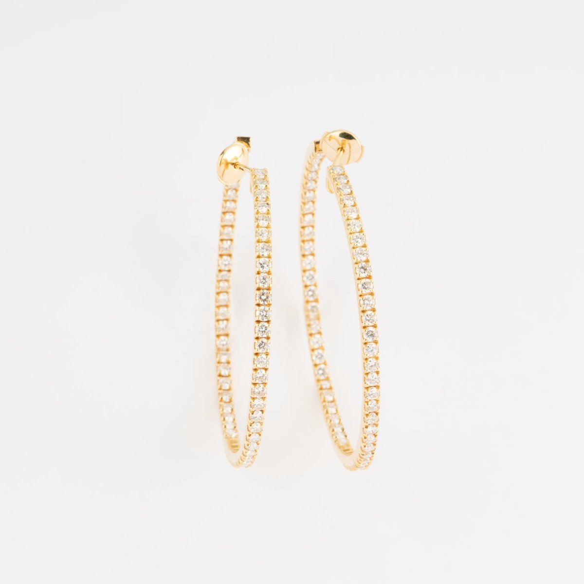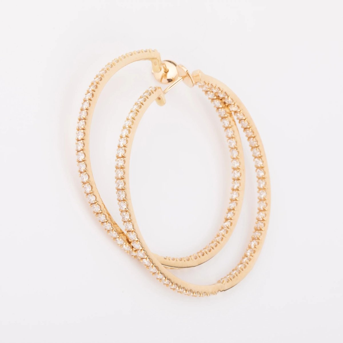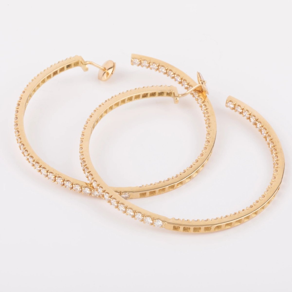 Yellow gold hoop earrings paved with beautifully diamond-cut brilliant-cut diamonds on the top and inside. Material: Yellow gold Hallmark: Eagle head Weight: 15.1 grams Diameter: 5 cm For pierced ears not modifiable Carat number: 6 cts Number of stones: 112 stones Period: 2000