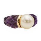 Ring signed by Maison Fred. in 750 thousandths (18 carat) yellow gold. set with a pearl. and 2 chiseled cabochon-cut amethysts. width on top: 0.89 cm. finger size: 52. total weight: 10.29 g. eagle head hallmark. excellent condition