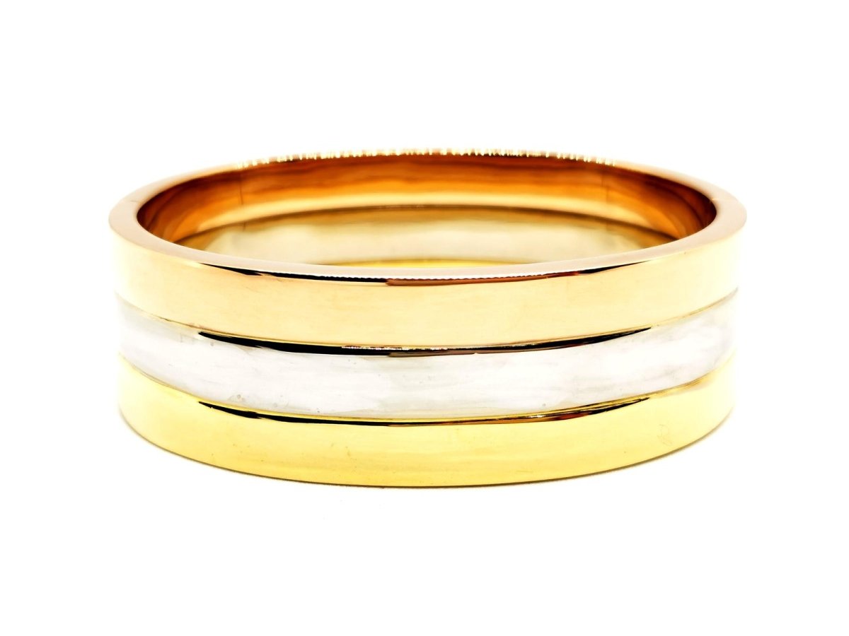 Rigid cuff bracelet signed by FRED in 3 18-carat golds, pink gold, yellow gold and white gold in an oval shape. Total weight: 65.45 g Size: 17.5cm Width: 2.03cm Thickness: 0.35cm Inner diameter: 5.8cm x 4.8cm Hallmark: owl