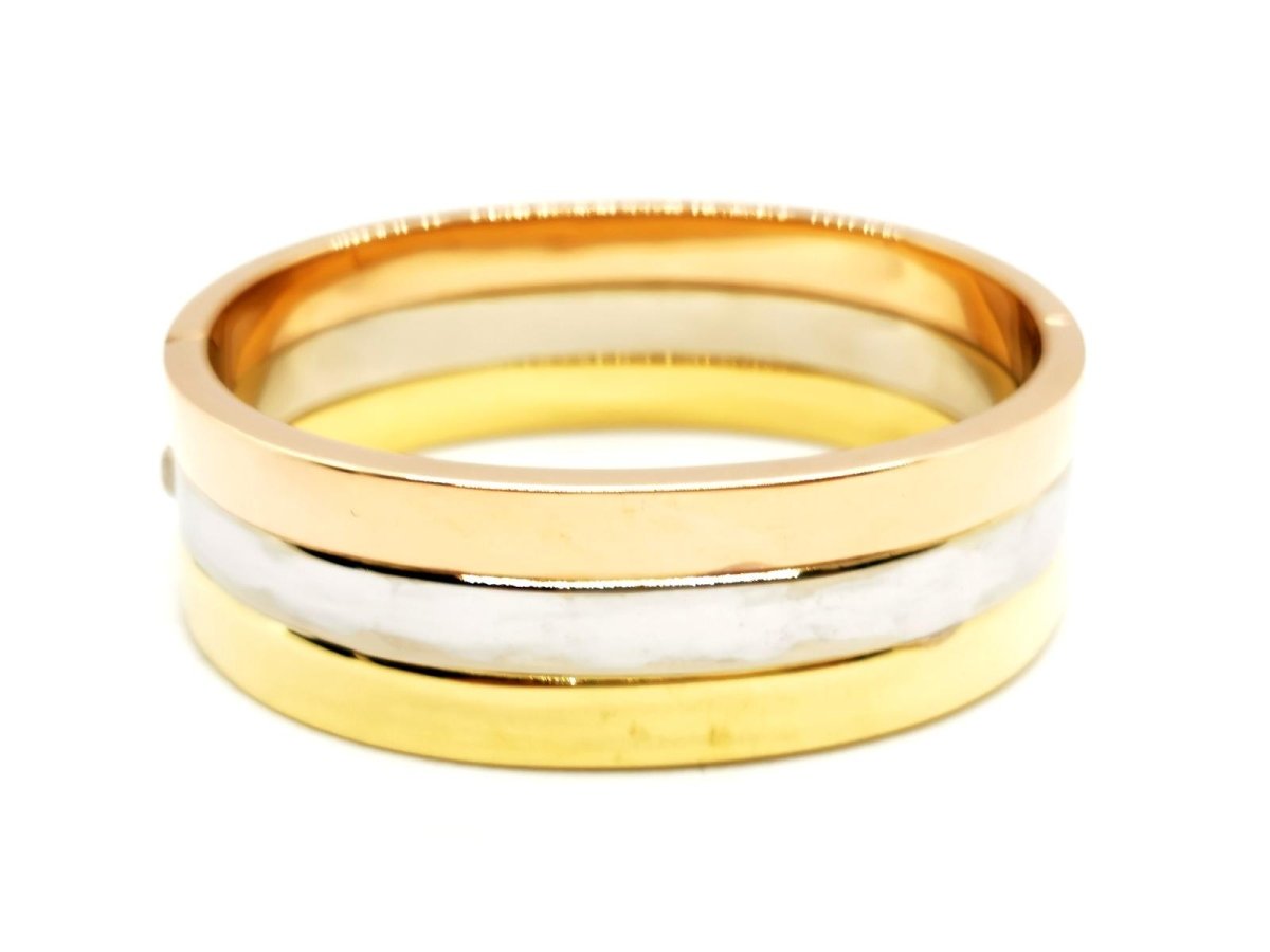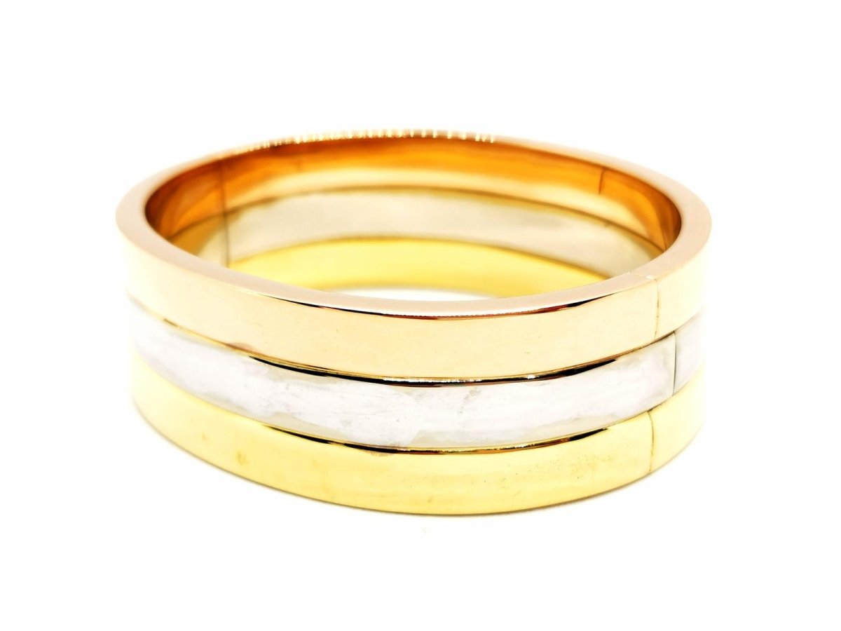 Rigid cuff bracelet signed by FRED in 3 18-carat golds, pink gold, yellow gold and white gold in an oval shape. Total weight: 65.45 g Size: 17.5cm Width: 2.03cm Thickness: 0.35cm Inner diameter: 5.8cm x 4.8cm Hallmark: owl