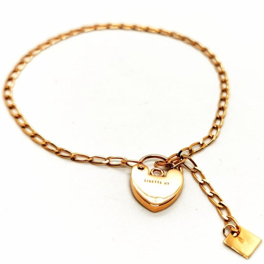 Bracelet signed by GINETTE NY, Providence model, in 18-carat pink gold. Cable link chain decorated with a heart-shaped padlock pendant. Total weight: 3.78 g Length: adjustable up to 21 cm Pendant dimensions: 1.54 cm x 1.14 cm Chain width: 0.22 cm Hallmark: eagle head