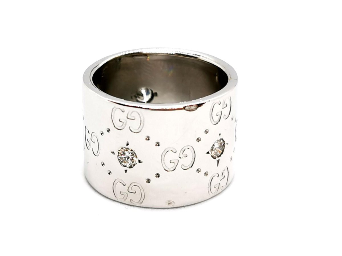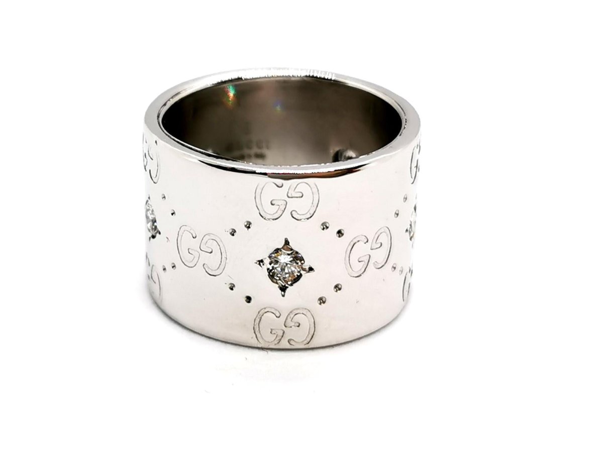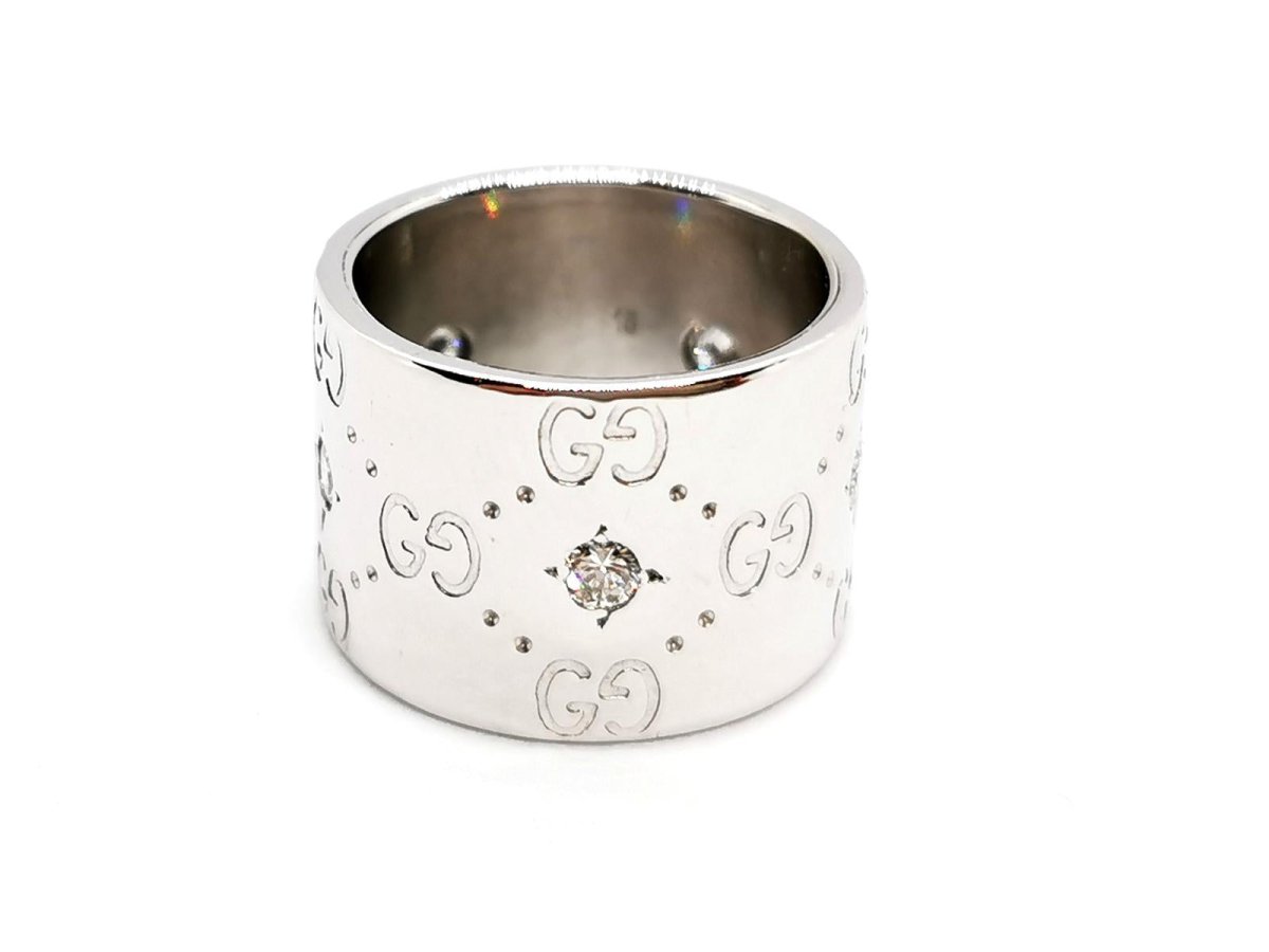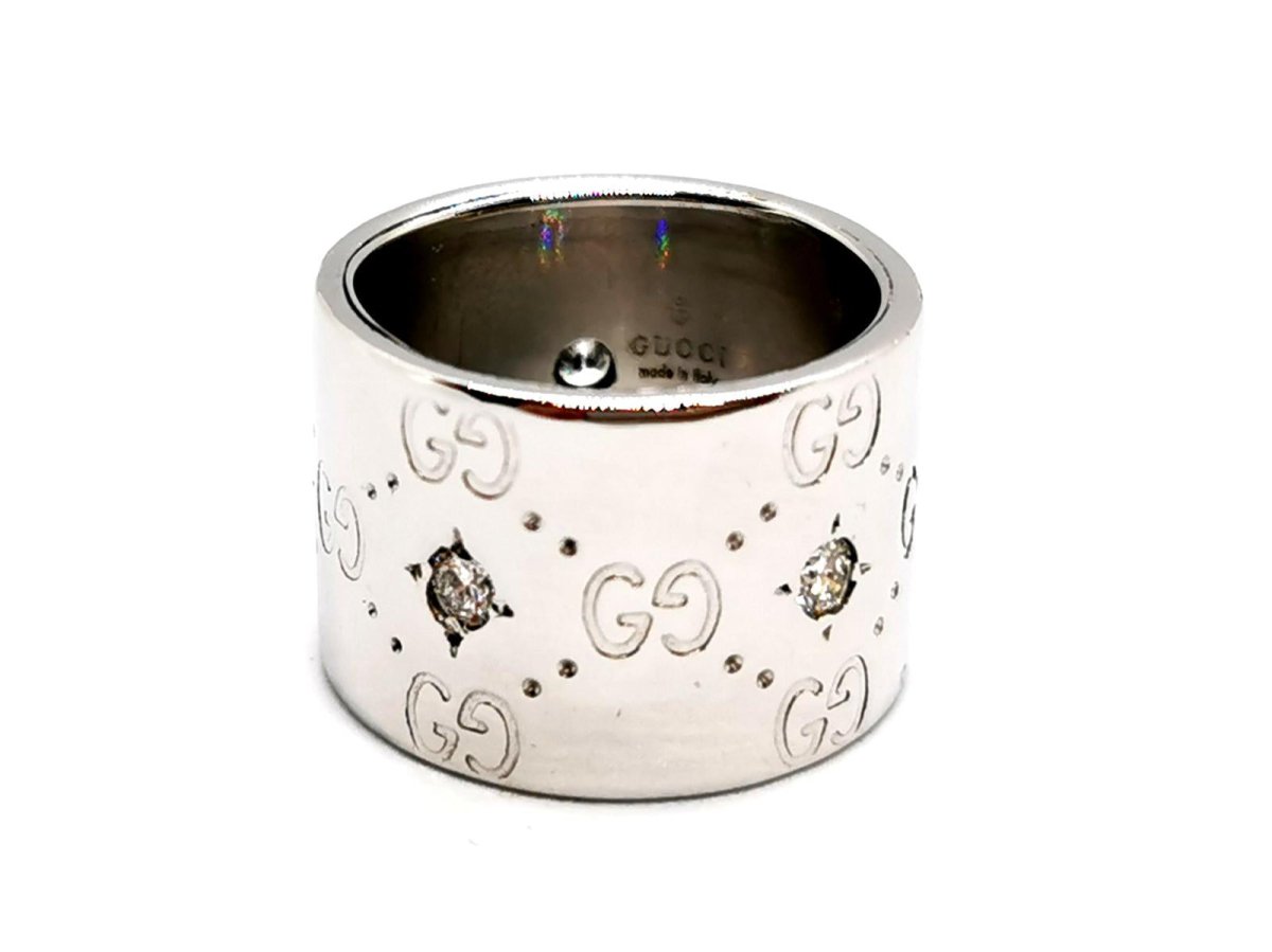 Ring signed by Gucci. Icon collection. in 750 thousandths (18 carat) white gold. set with 5 diamonds. brilliant cut. of approximately 0.05 ct each. total diamond weight: approximately 0.25 ct. finger size: 52. width on top: 1.38 cm. total weight: 13.39 g. Gucci signature. the diamonds were added to the original model. Owl hallmark. Excellent condition.