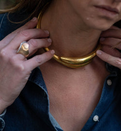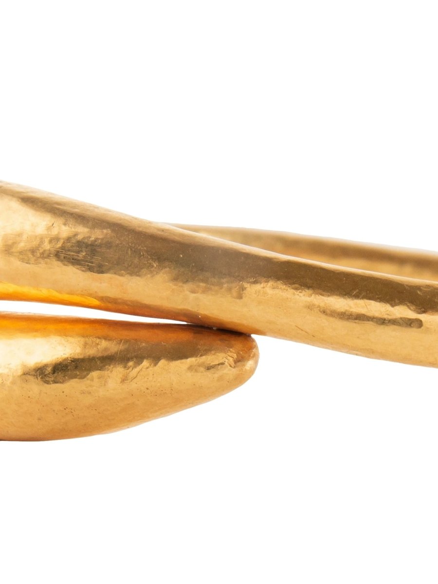 Torque Necklace signed ILIAS LALAOUNIS in 22-carat yellow gold with hammered surface formed by two stylized snakes whose heads intersect. Gross weight: 98.4 g Signed A.21, K22 Lalaounis hallmark