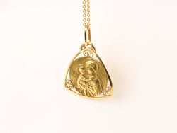 18k (750°/°°) gold medal in a triangular shape composed of a medallion representing the Virgin and Child and decorated with arabesques. Signed Mazzoni and presence of a trace of maker's mark French work in Art Nouveau style Excellent general condition, tiny scratches from use, the medal can be repolished on request Gross weight: 3.9 grams Height (without bail): 2.5 cm