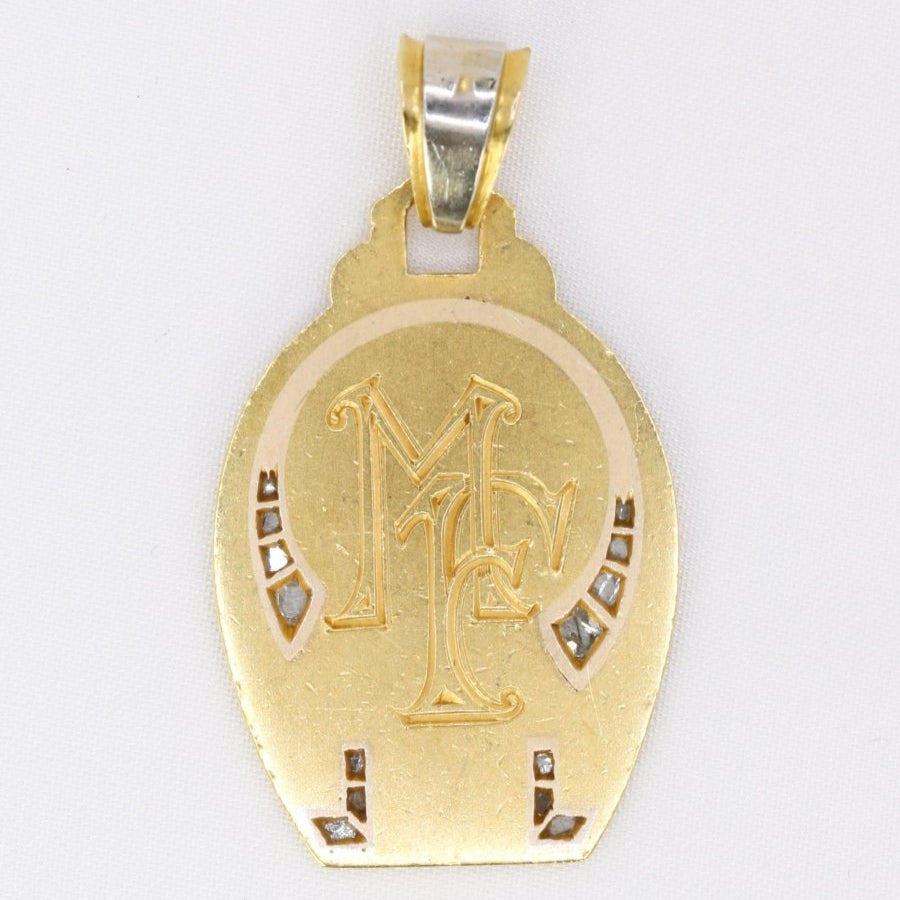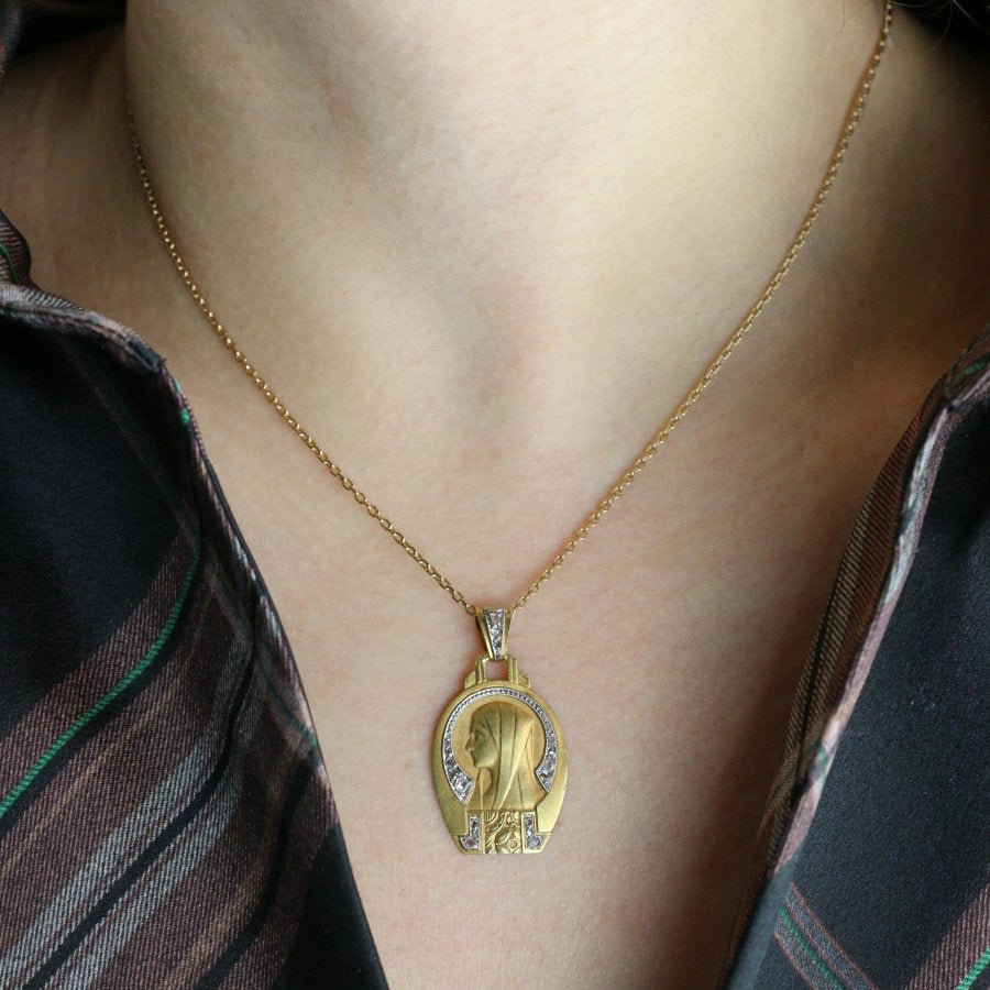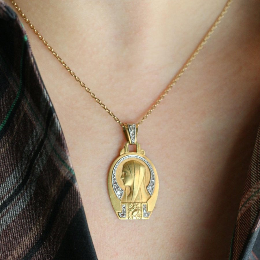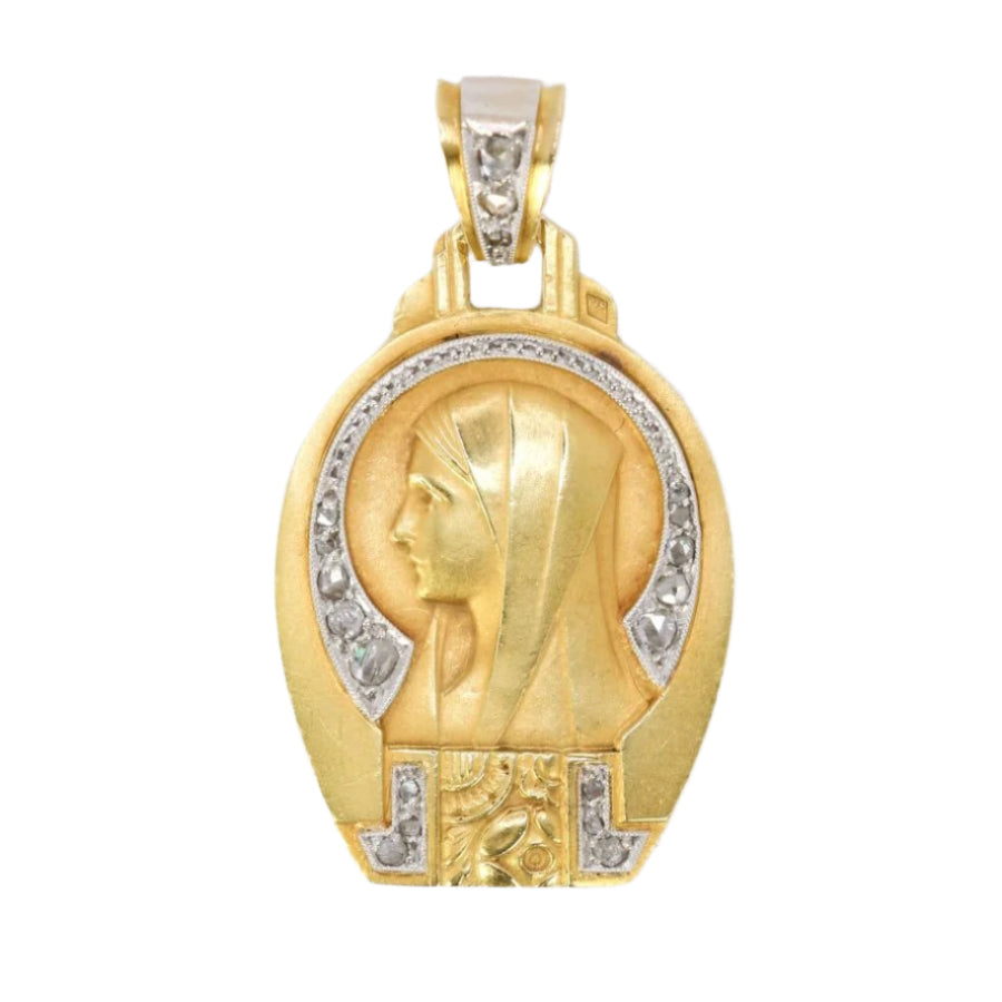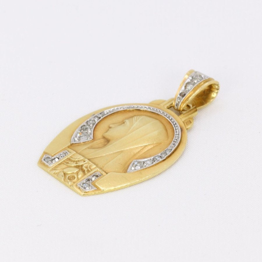 Religious medal Art Deco Virgin in profile yellow gold diamonds rose cut