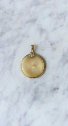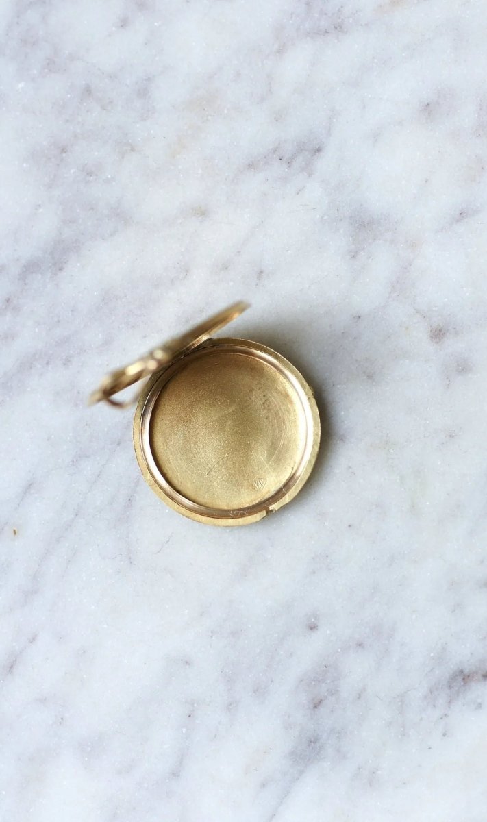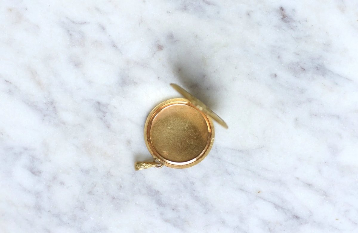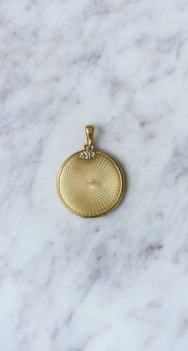 Pendant, photo locket, round in 18Kt yellow gold (hallmark: eagle's head) guilloché with garland decorations. French work from the beginning of the 20th century, circa 1900, Belle Epoque. Gross weight: 4.72 g Height (with bail): 3.40 cm Width: 2.50 cm Condition: very light micro scratches and oxidation on the gold parts, see photos. Did you know that the " Belle Epoque " was named after the First World War, in memory of this carefree period? All our antique pendants.
