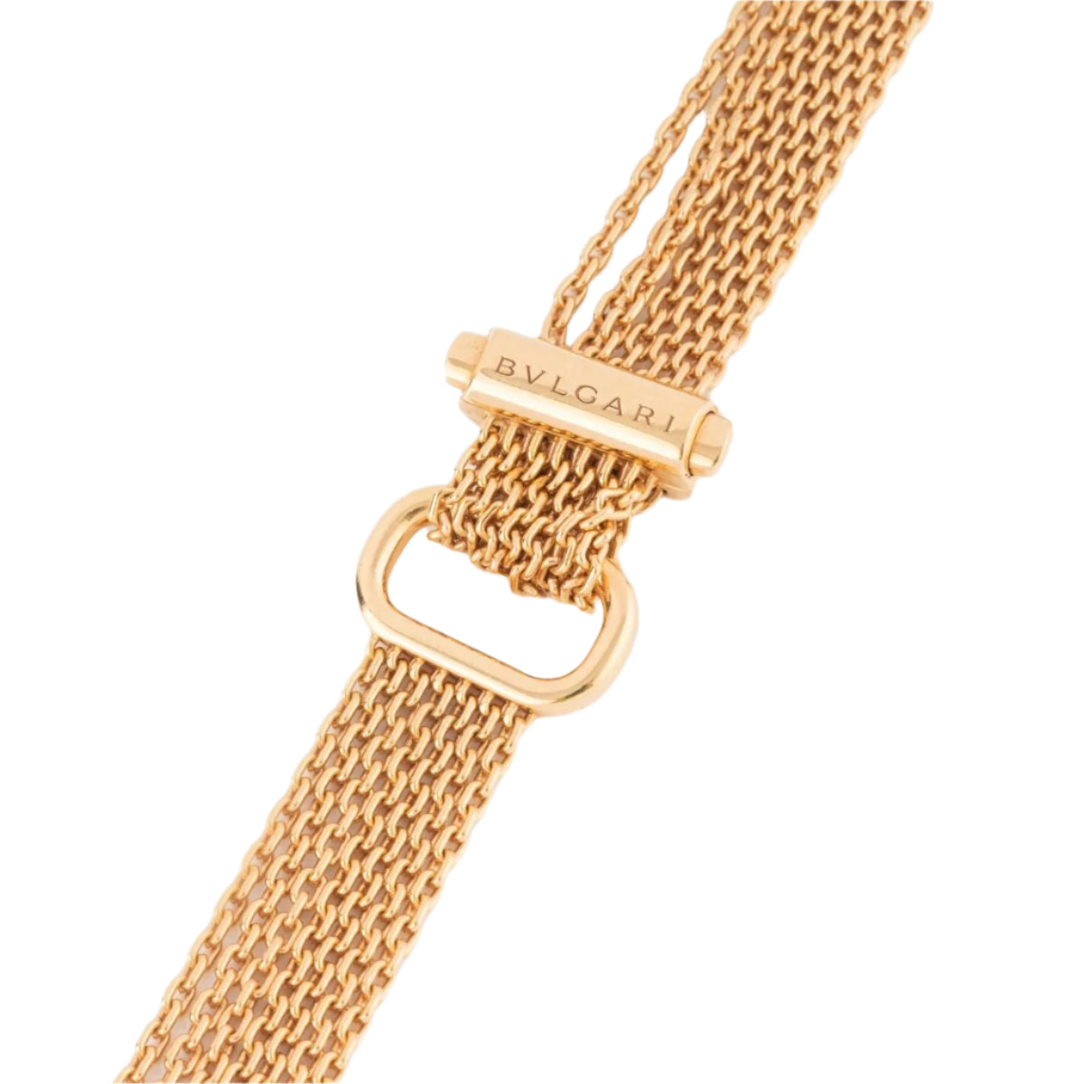 BULGARI Serpenti watch. 27 mm curved case in 18K rose gold, set with brilliant-cut diamonds. Rose gold crown set with a cabochon-cut pink rubellite. Dial paved with snow-set diamonds. 18K rose gold spiral chain bracelet. Quartz movement. Circa 2000.