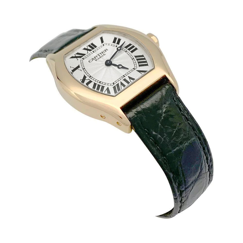A watch signed by Maison Cartier, 'Tortue' model, in 750/000 yellow gold on a leather strap. Silver guilloché dial, Roman numerals, skeleton back. 750/000 rose gold folding clasp. Length: 33mm Width: 27mm Movement: Mechanical