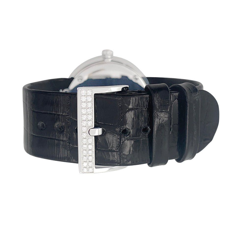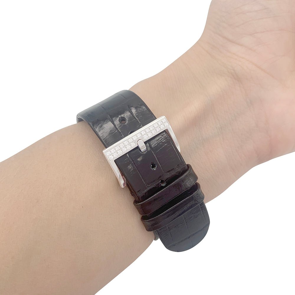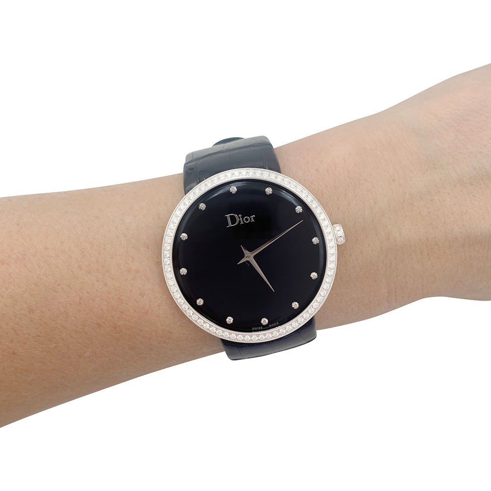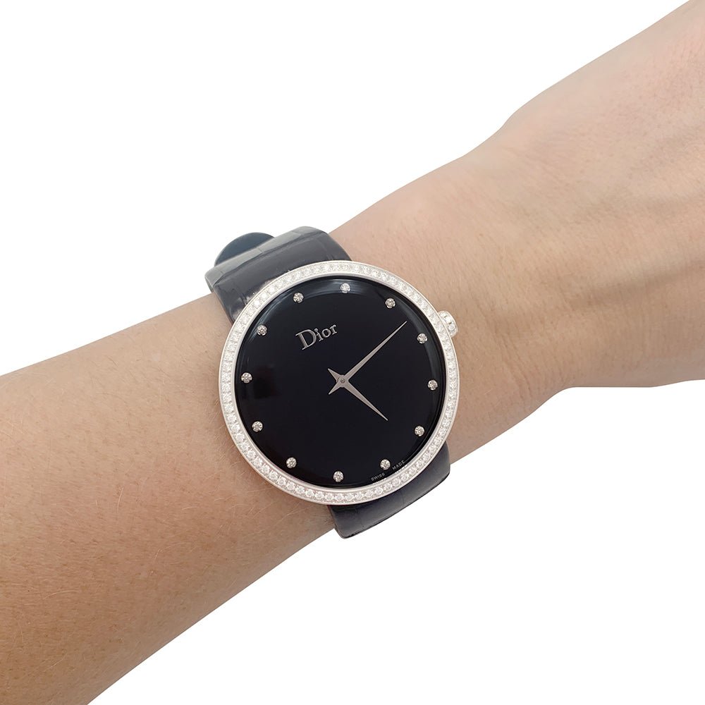 A watch signed by the House of Dior, “La D de Dior” collection, in steel on a leather strap with a steel pin buckle set with brilliant-cut diamonds. The bezel, indexes and crown are set with brilliant-cut diamonds. Black dial. Diameter: 38mm Movement: Quartz New price: 7900