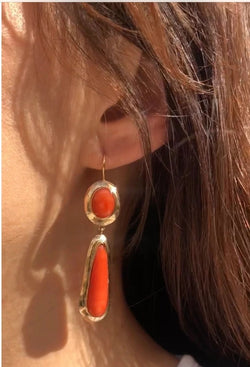 Pair of 18k rose gold and orange coral earrings in Napoleon III elongated cabochon with swan neck closure. For non-pierced ears modifiable Material: 18k rose gold Hallmark: Owl Weight: 5.7 grams Length: 5.5cm Period: Napoleon III