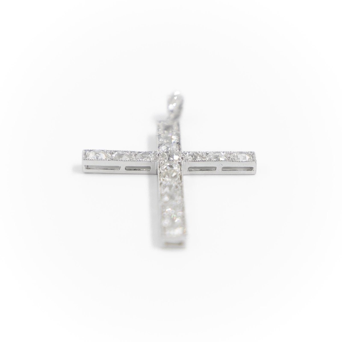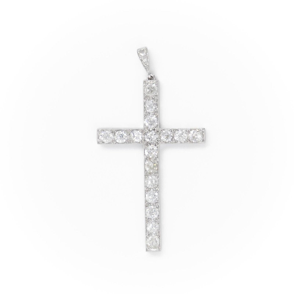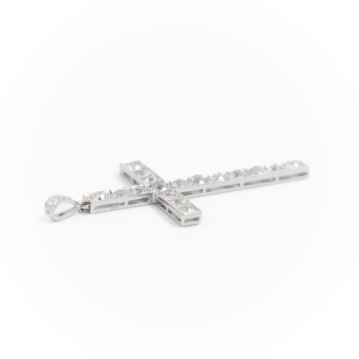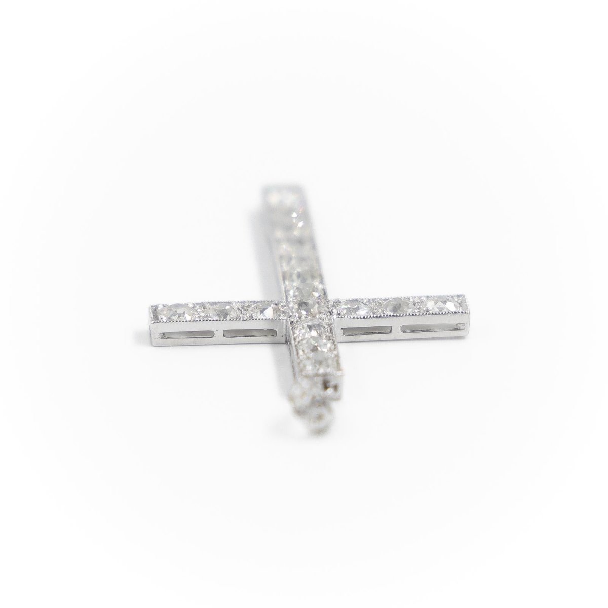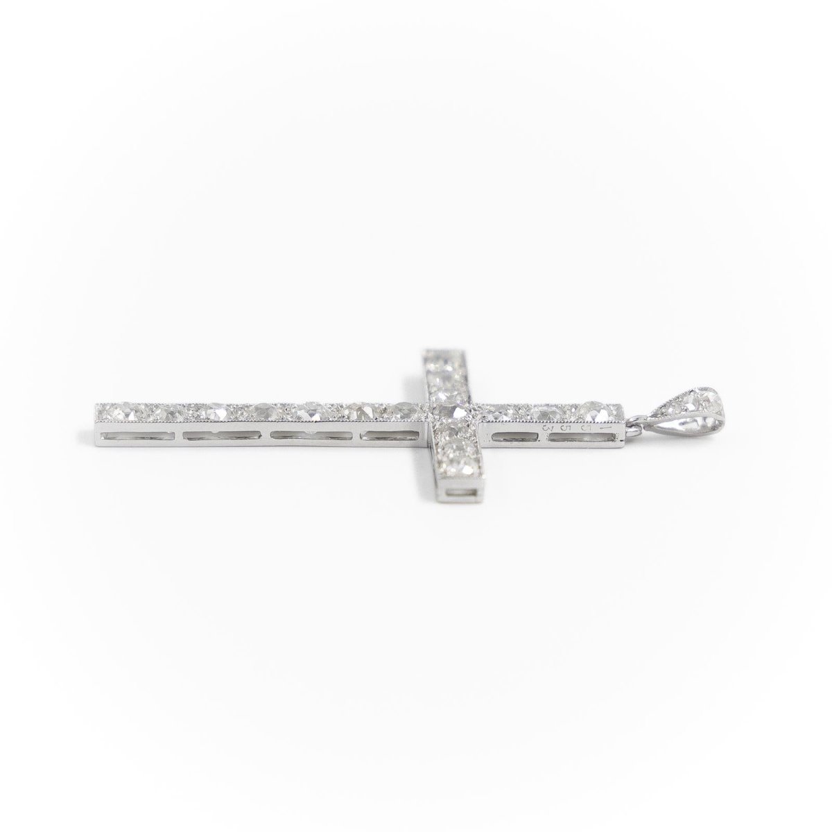 Pendant in 900 thousandths platinum representing a Catholic cross set with 20 diamonds: 17 old cut diamonds of approximately 0.10 carat each and 3 rose cut diamonds on the bail (2 of approximately 0.01 carat each and one of approximately 0.03 carat). Engraved 1553 on one side. Total weight: 2.95 g Length: 4.45cm Width: 2.35cm Hallmark: dog head